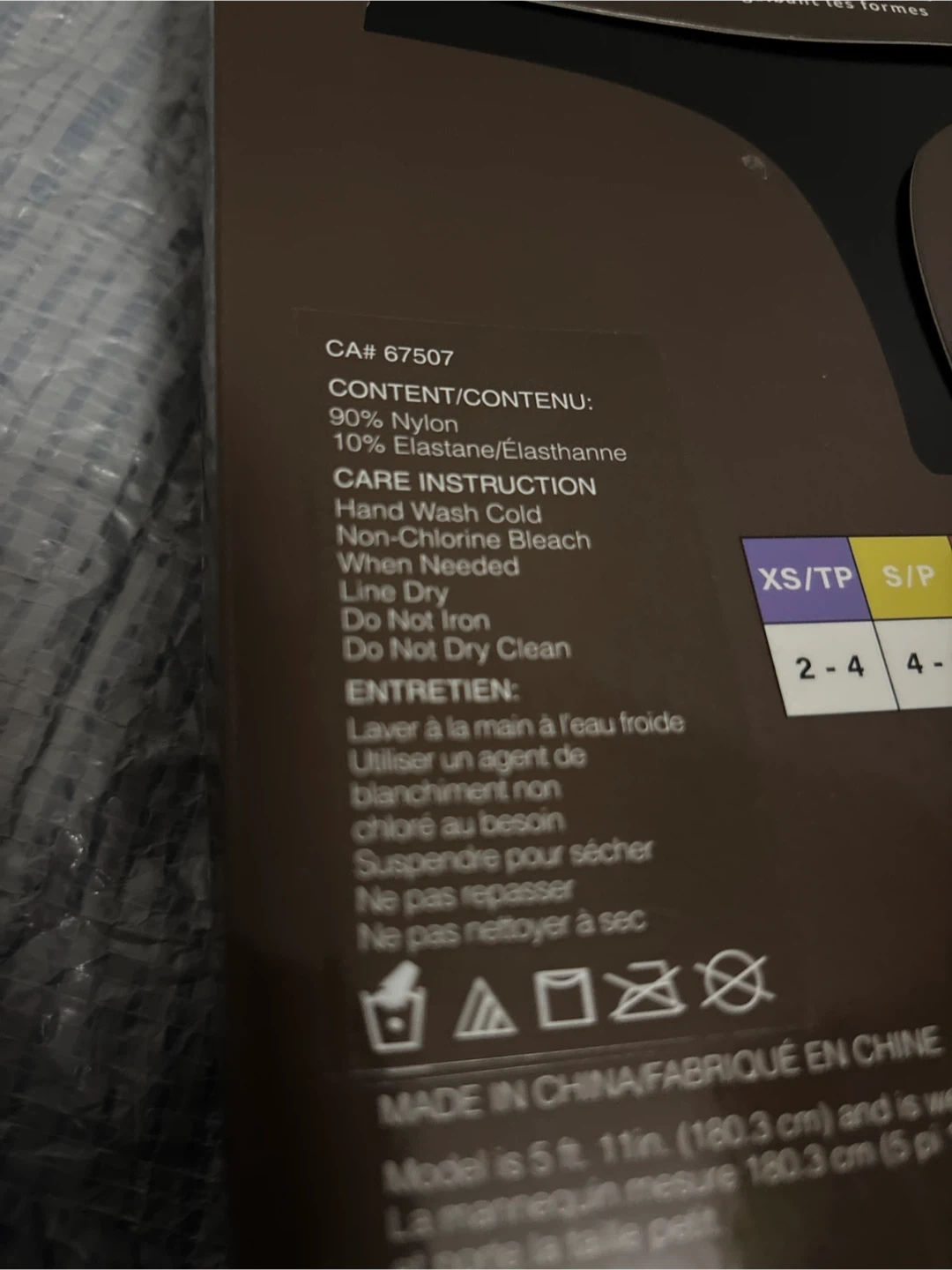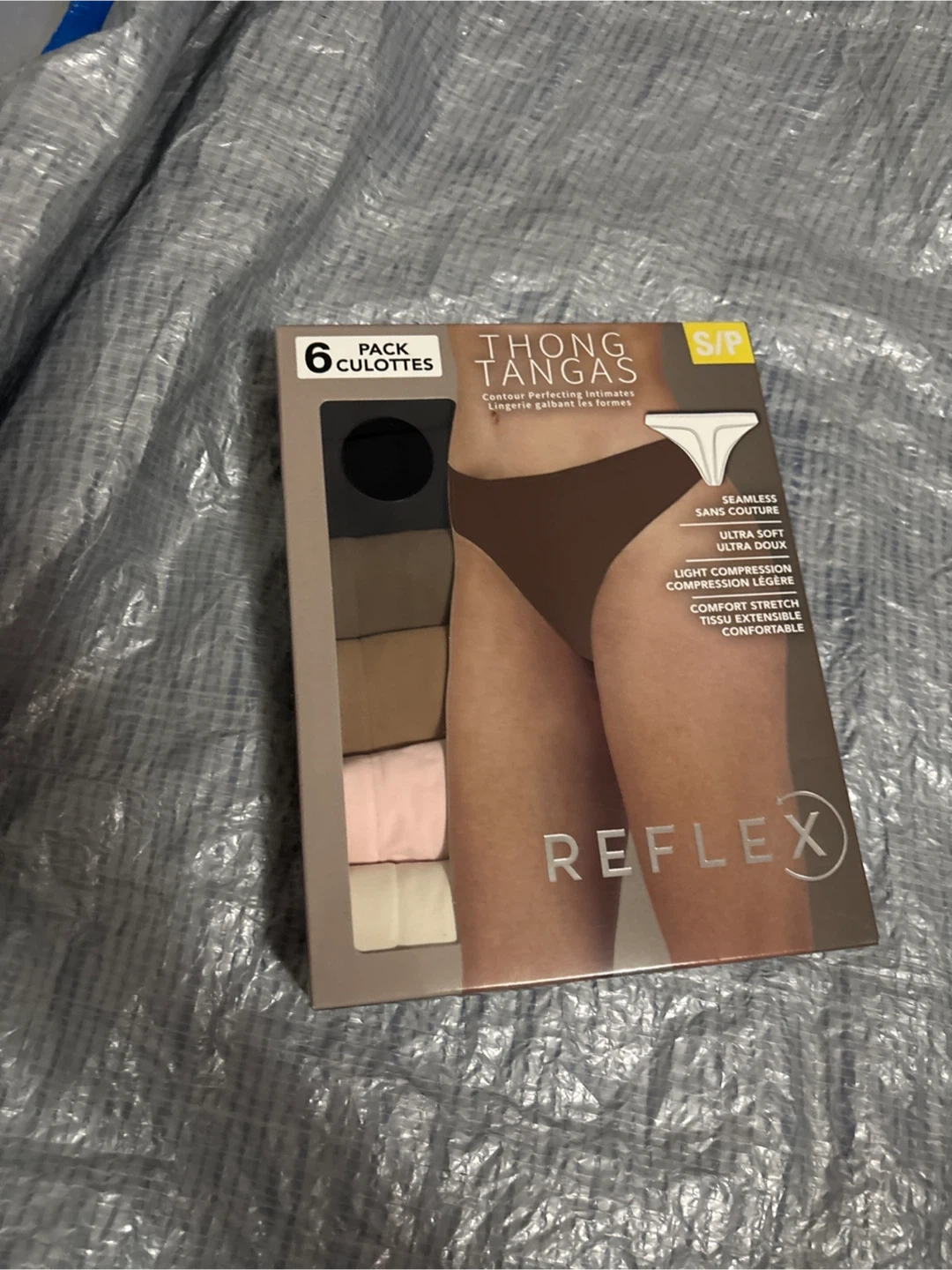 Selling a 6-pack of Reflex Thong Tangas in size S/P. They are contour perfecting intimates and are made of 90% Nylon and 10% Elastane. The care instructions are hand wash cold, non-chlorine bleach when needed, line dry, and do not iron or dry clean