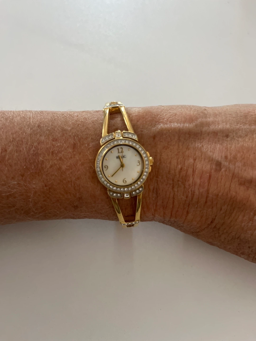 Selling a stylish Relic women's bracelet watch! The watch features a gold-tone finish and a unique bracelet design. It has a round face with clear numbering, making it easy to read the time. Needs new battery