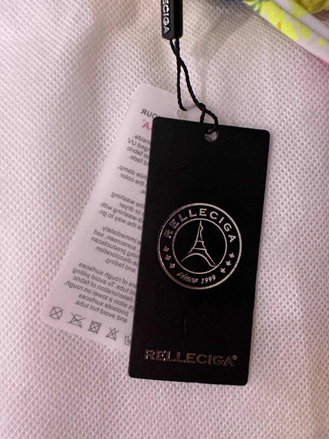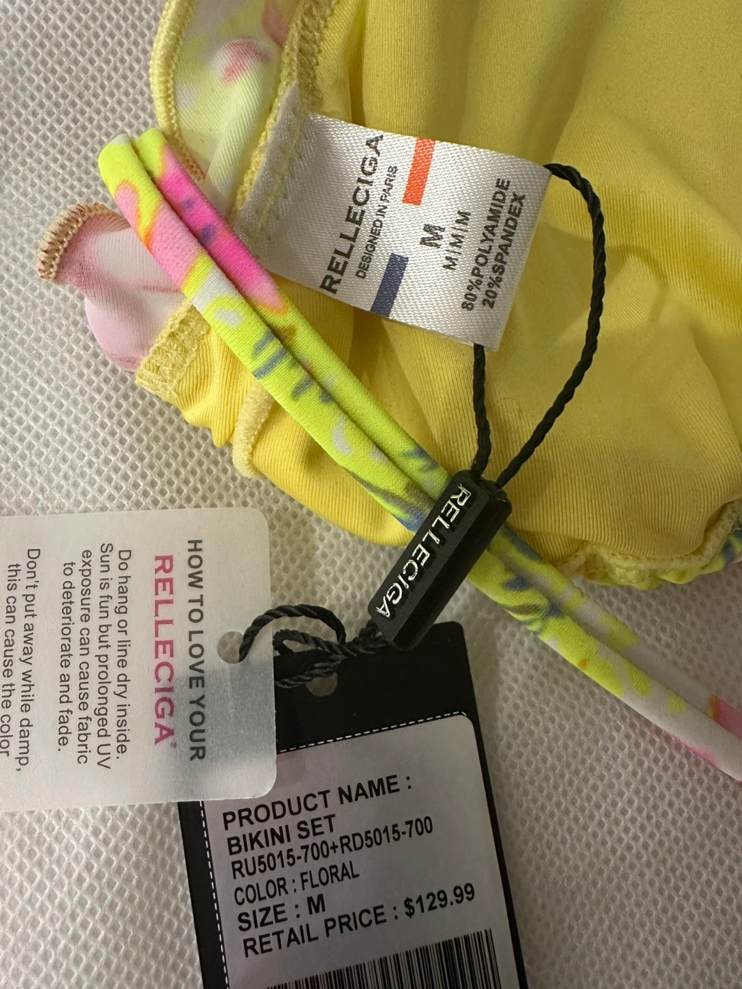 Brand new Relleciga bikini. Floral print. Size medium. Triangle top and cheeky bottom. Adjustable straps. Ruched detailing.