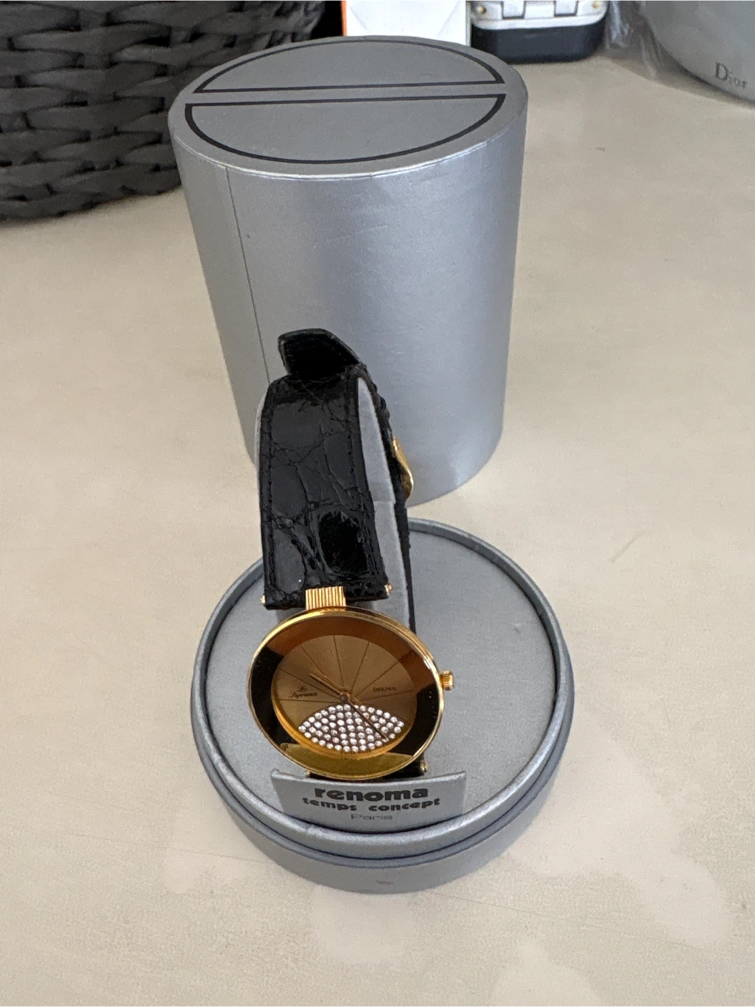 Selling a Renoma Temps Concept watch. It features a gold-tone case with a unique dial design and a black leather strap. Comes with the original box!