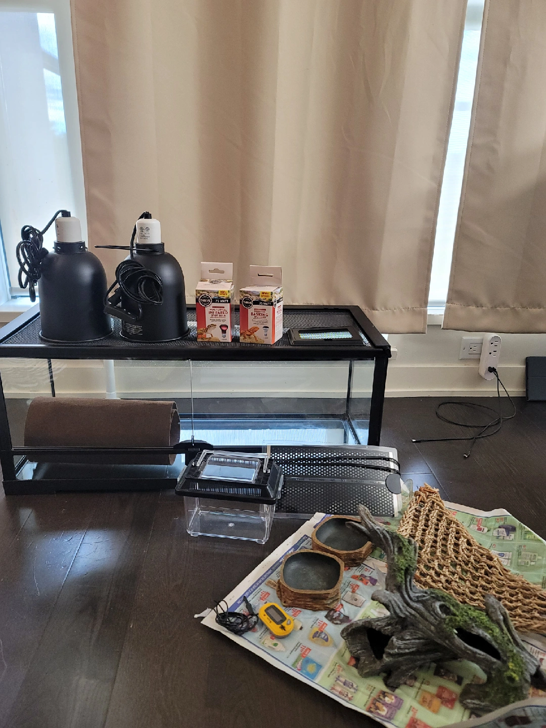 Selling a reptile terrarium with lots of accessories! It includes: - Two heat lamps - Two infrared spot bulbs - Water and food dishes - A hide - A climbing net - A piece of decorative wood There is some damage to the glass (see photos).