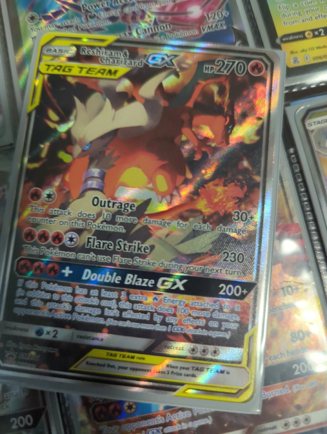 Selling a Reshiram & Charizard GX Tag Team Pokemon card. This card has 270 HP and features the Double Blaze GX attack. Great addition to any collection!
