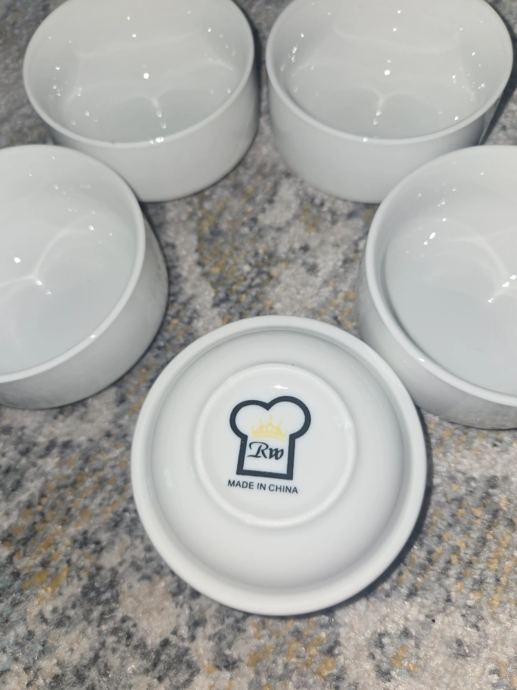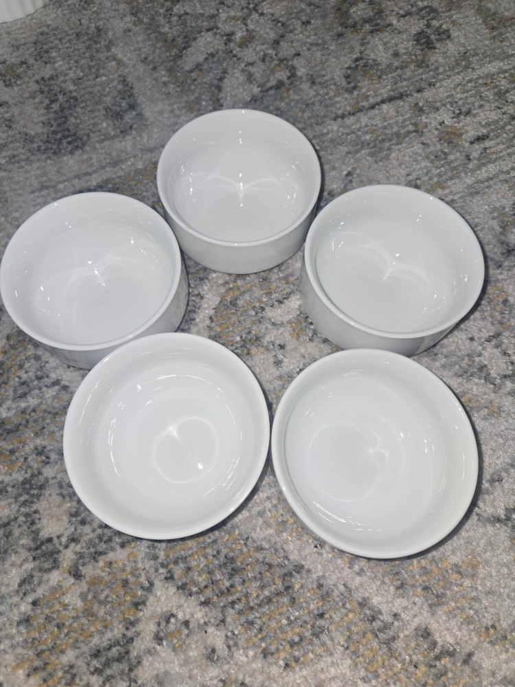 Selling a set of 5 Restaurant Ware white porcelain bowls! They're in great condition and ready for a new home. Perfect for soups, desserts, or snacks. They're made in China.