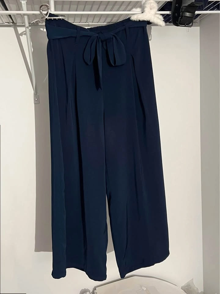 Size: US 6/8 Waist: 68–78 cm (adjustable waistband with 10cm stretch) Outseam Length: 88 cm Fit: Wide-leg, relaxed silhouette Color: Deep navy blue Material: Breathable, ultra-comfortable fabric – feels soft and airy on the skin Features: * Stylish front pleats * Removable bow knot belt * Elastic waistband for a flexible fit * Lightweight and flowy Condition: Gently worn and in very good condition, no visible flaws. Perfect for spring, summer, and fall, they’re designed for both casual and office wear. Original Price: $78 Pickup location: 501 Yonge St I also have other pants, trousers, T-shirts, and sweatshirts listed. If you're interested in buying multiple items, I’m happy to offer a bundle discount.