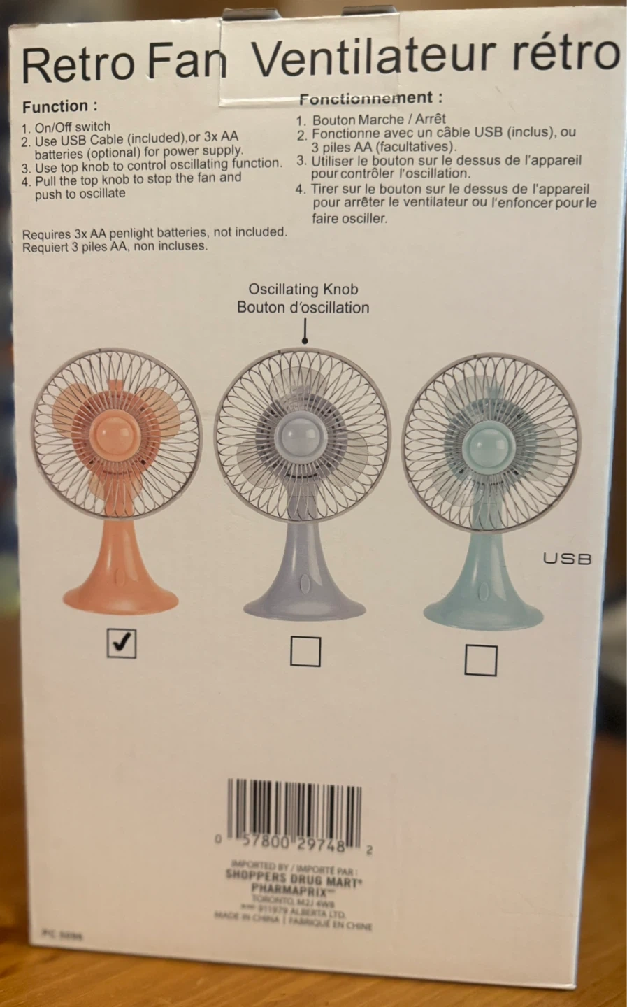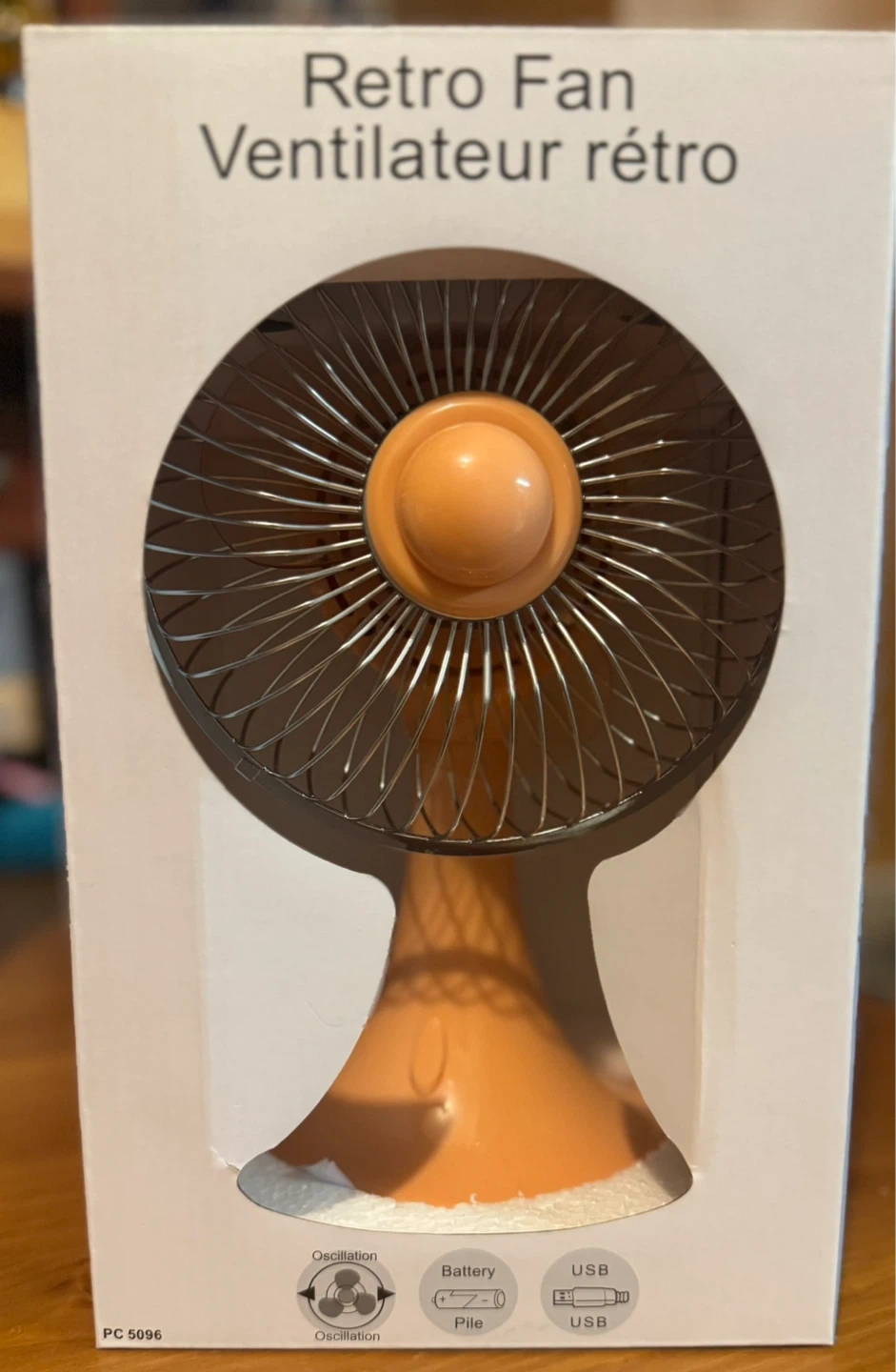 Retro fan that can be operated with a USB cable (included) or 3x AA batteries (not included) - On/Off switch - Use top knob to start oscillation function - Tilt the top knob to stop the fan and push to oscillate