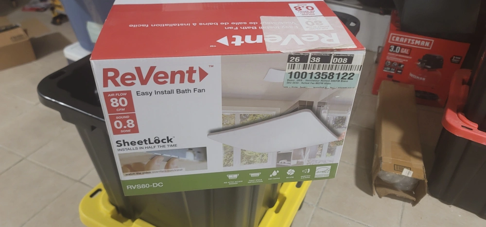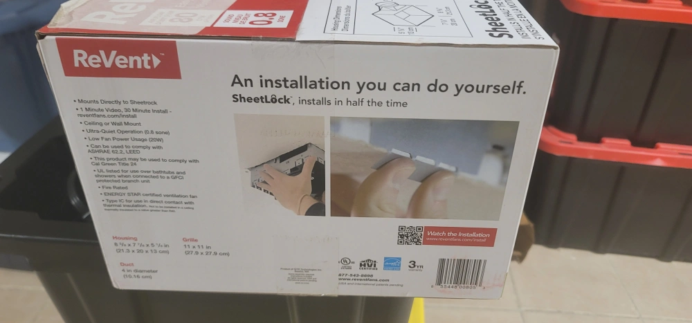 Selling a Brand New ReVent SheetLock RVS80-DC easy-install bath fan. This fan is designed for easy installation and mounts directly to the sheetrock. It's an energy-efficient fan with low power usage and operates ultra-quietly at 0.8 sone. The housing dimensions are 8 1/2" x 11" x 5 1/8", and the grille is 11" x 11". It comes in its original box