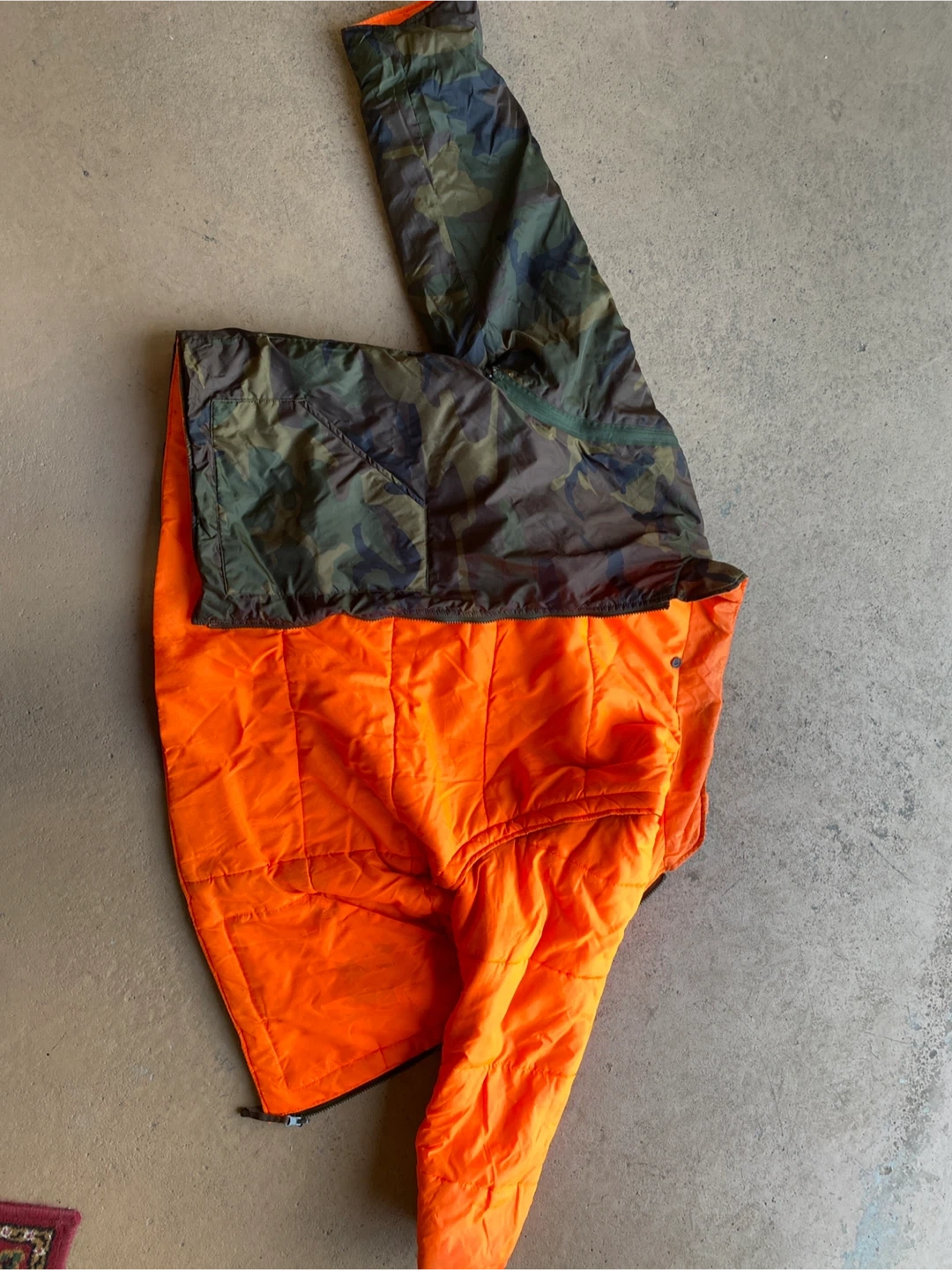 Selling a reversible hunting jacket! One side features a camouflage pattern, and the other side is a bright orange colour. Perfect for staying visible and safe during hunting season Removable sleeves OBO
