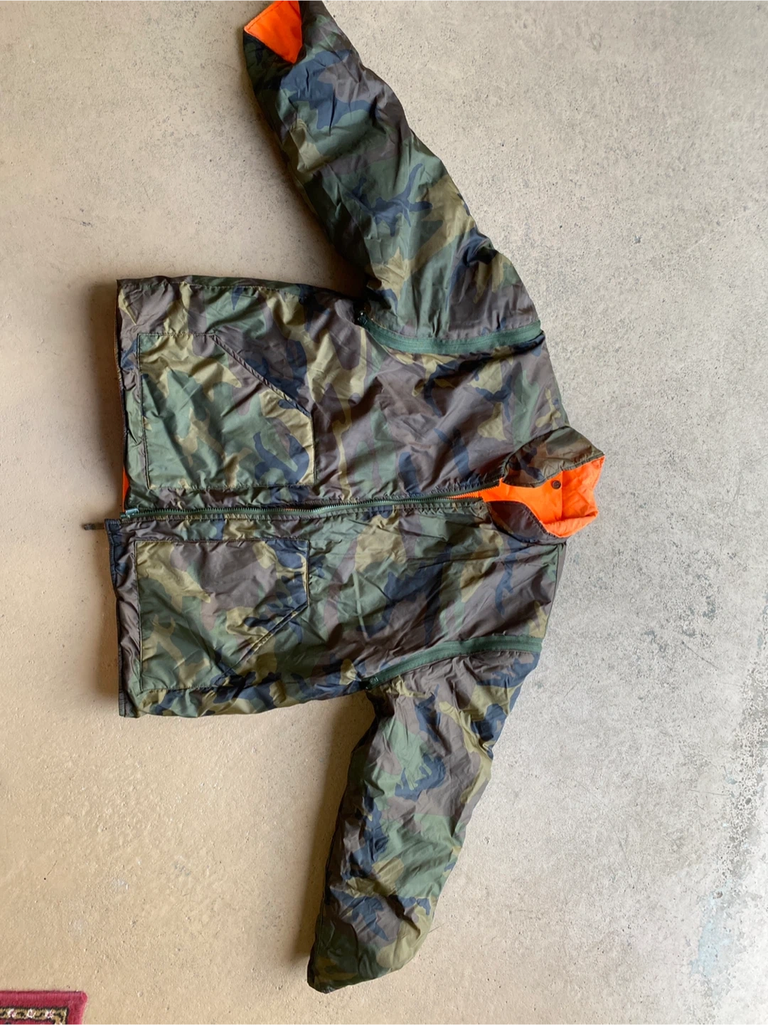 Selling a reversible hunting jacket! One side features a camouflage pattern, and the other side is a bright orange colour. Perfect for staying visible and safe during hunting season Removable sleeves OBO