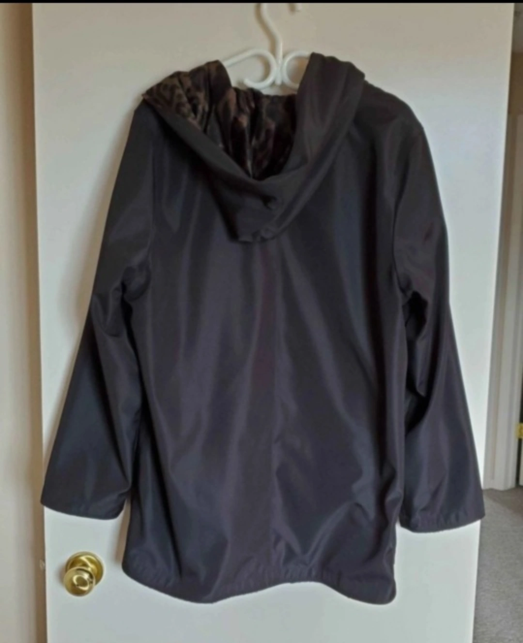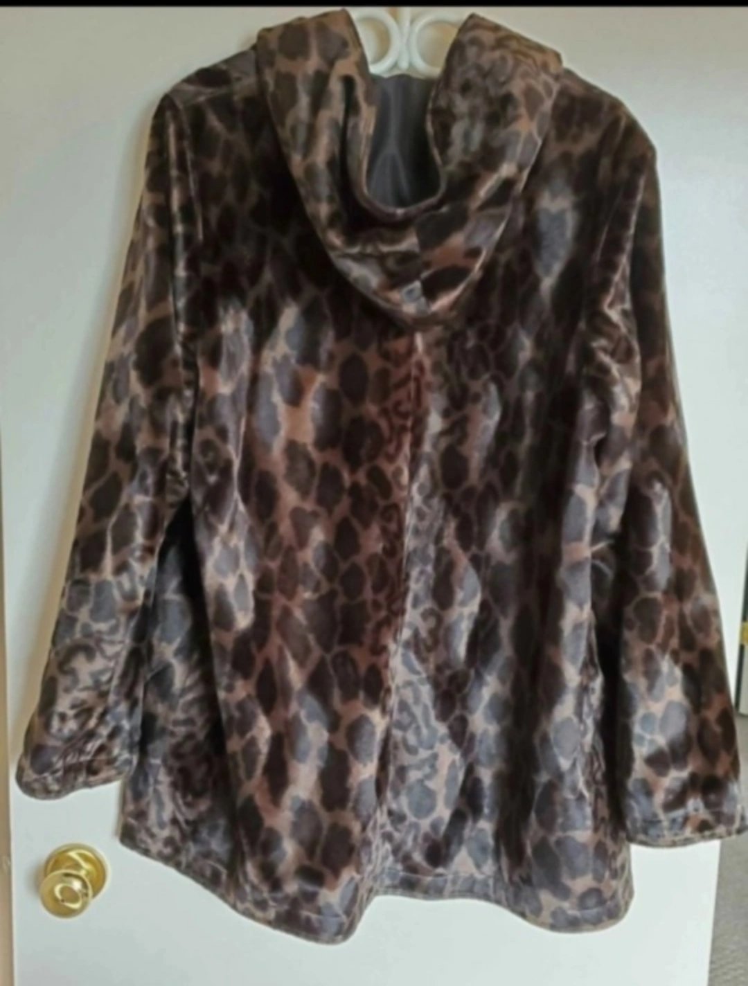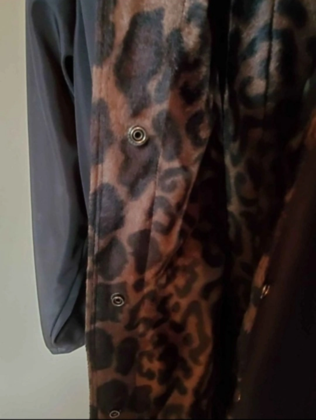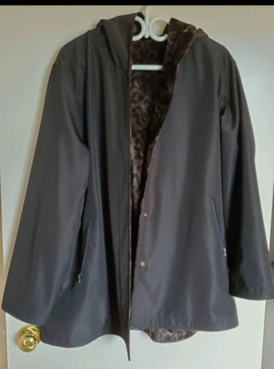 Check out this stylish reversible hooded jacket! One side is a sleek black, and the other features a fun leopard print. It's perfect for adding a bit of flair to your outfit and staying cozy on cooler days. Excellent condition, only worn a couple times!