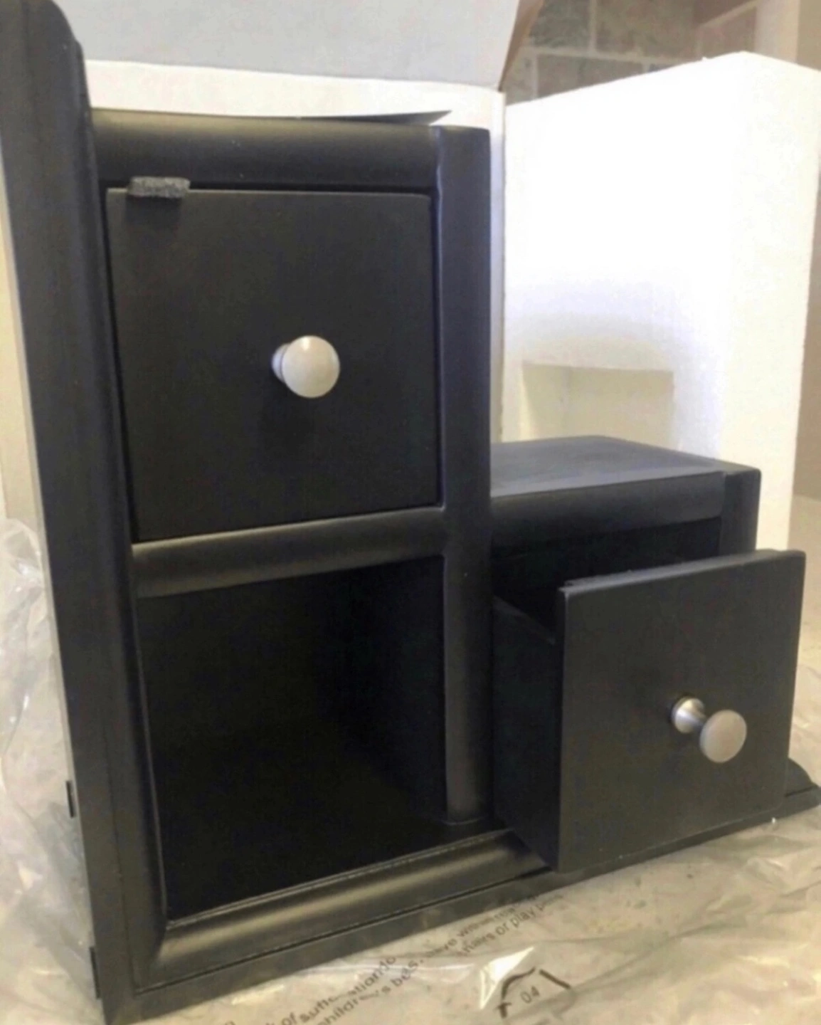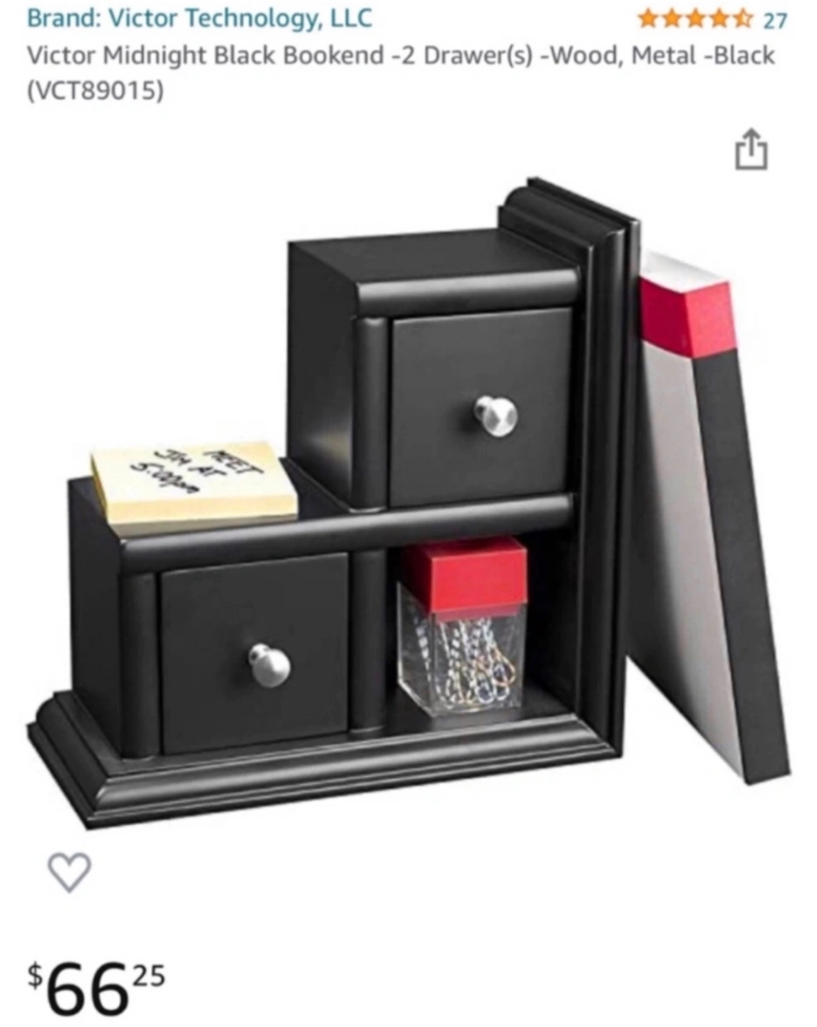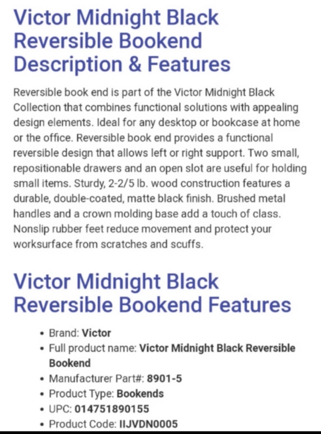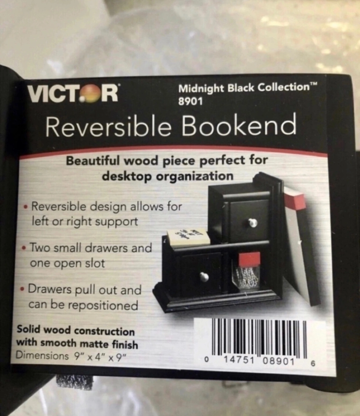 * or purchase 2 for $50 * * Brand New In Box * VICTOR Midnight Black Collection™™ Reversible Bookend Dimensions 9" × 4" x 9" • Beautiful wood piece perfect for any desktop or bookcase at home or the office • Reversible design allows for left or right support • Two small drawers and one open slot • Drawers pull out and can be repositioned • Solid wood construction with smooth matte finish