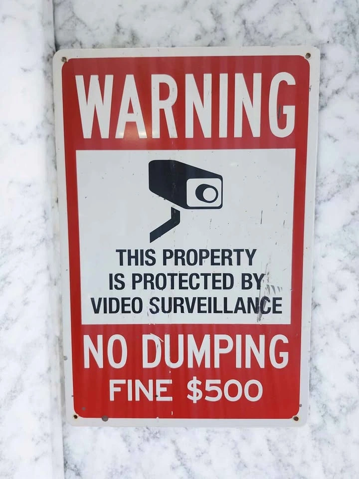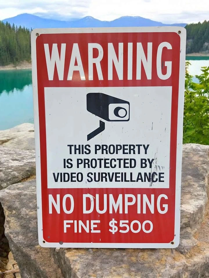 Warning sign that states: WARNING THIS PROPERTY IS PROTECTED BY VIDEO SURVEILLANCE NO DUMPING FINE $500 The sign also features a graphic of a security camera. The sign is placed on a rock with a body of water and mountains in the background.