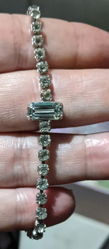 This is a lovely rhinestone bracelet. It features small square rhinestones and a larger rhinestone in the center. It would be a great addition to your jewelry collection!