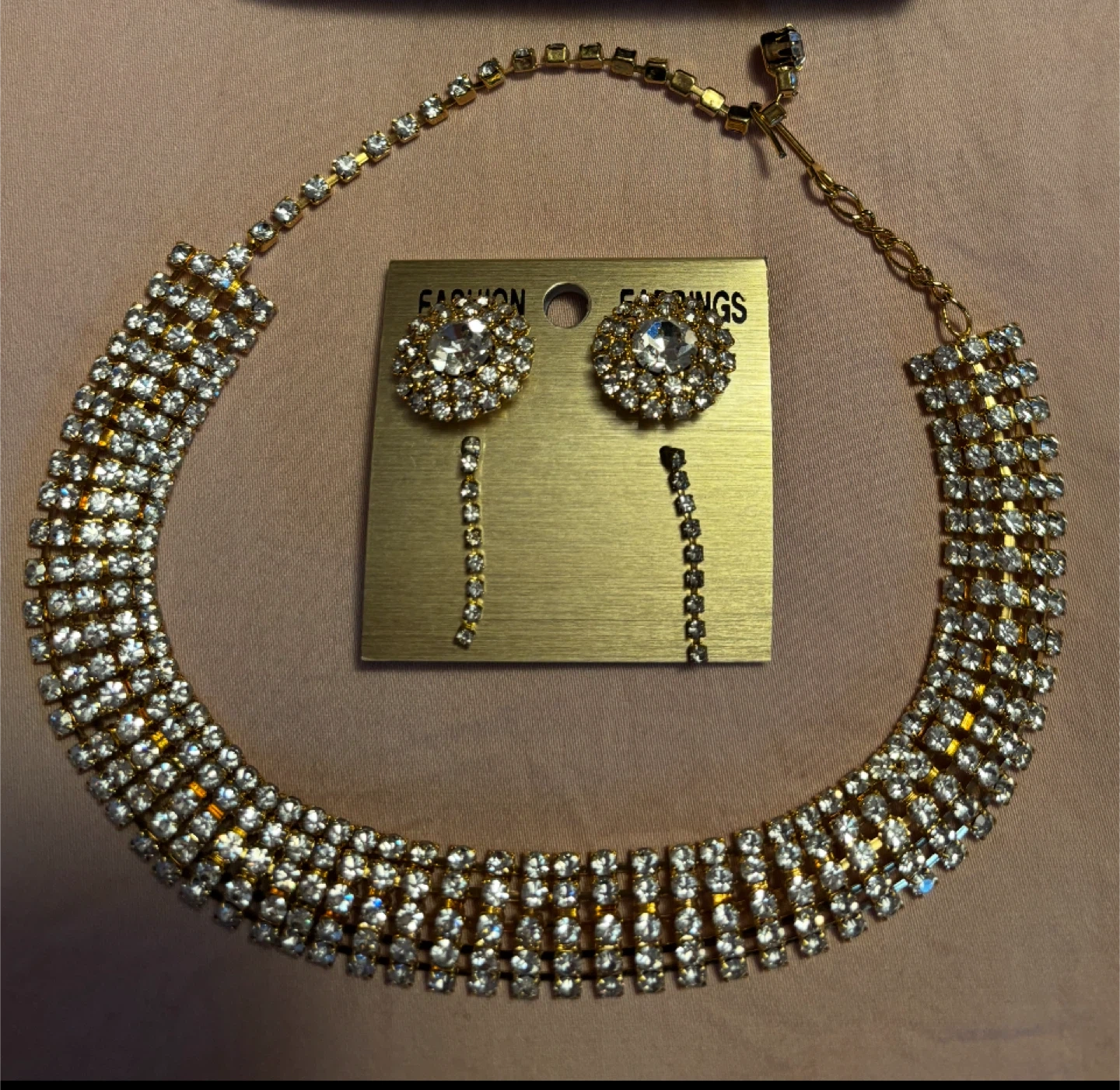Sparkle with 3piece matching set of beautiful gold&rhinestone bracelet,necklace and earrings set! Perfect for adding a touch of glamour to any outfit. The set features a matching necklace and earrings, both adorned with dazzling rhinestones. A great addition to your costume jewellery collection
