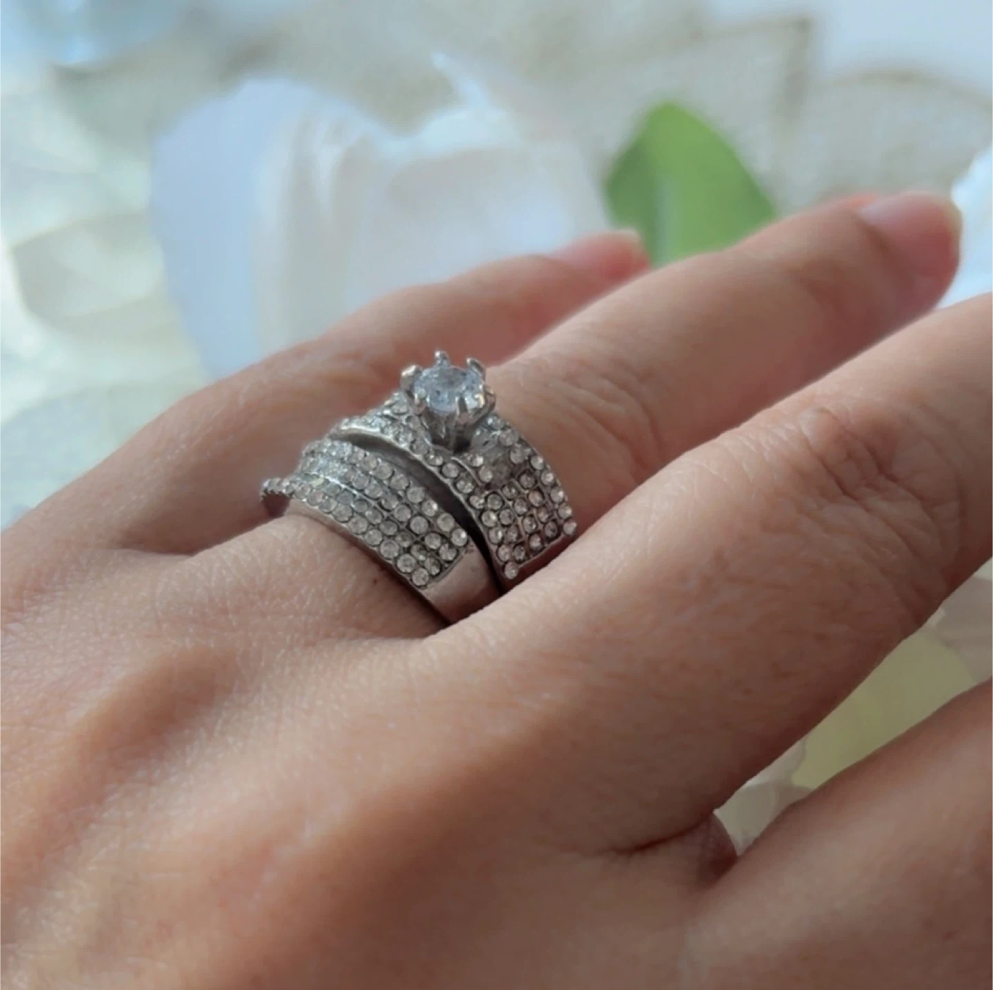 Beautiful Sparkly rhinestone ring set! This eye-catching set features a band and a ring, both covered in shimmering rhinestones. Perfect for adding a touch of glam to any outfit.