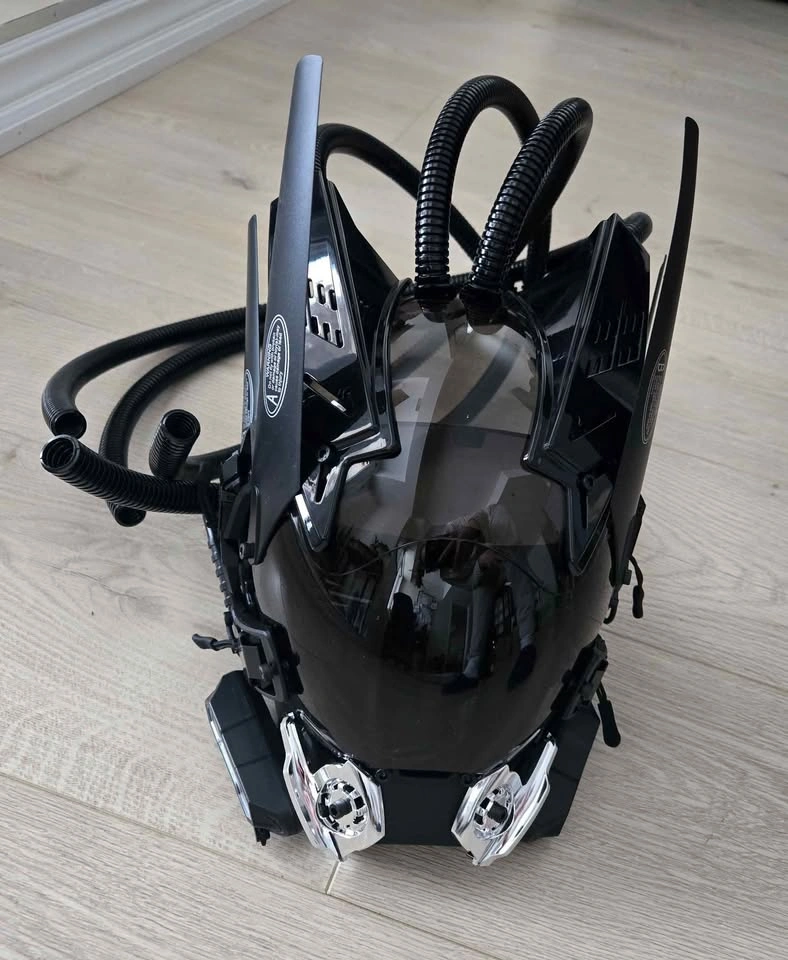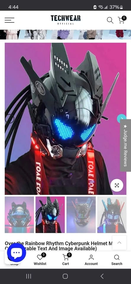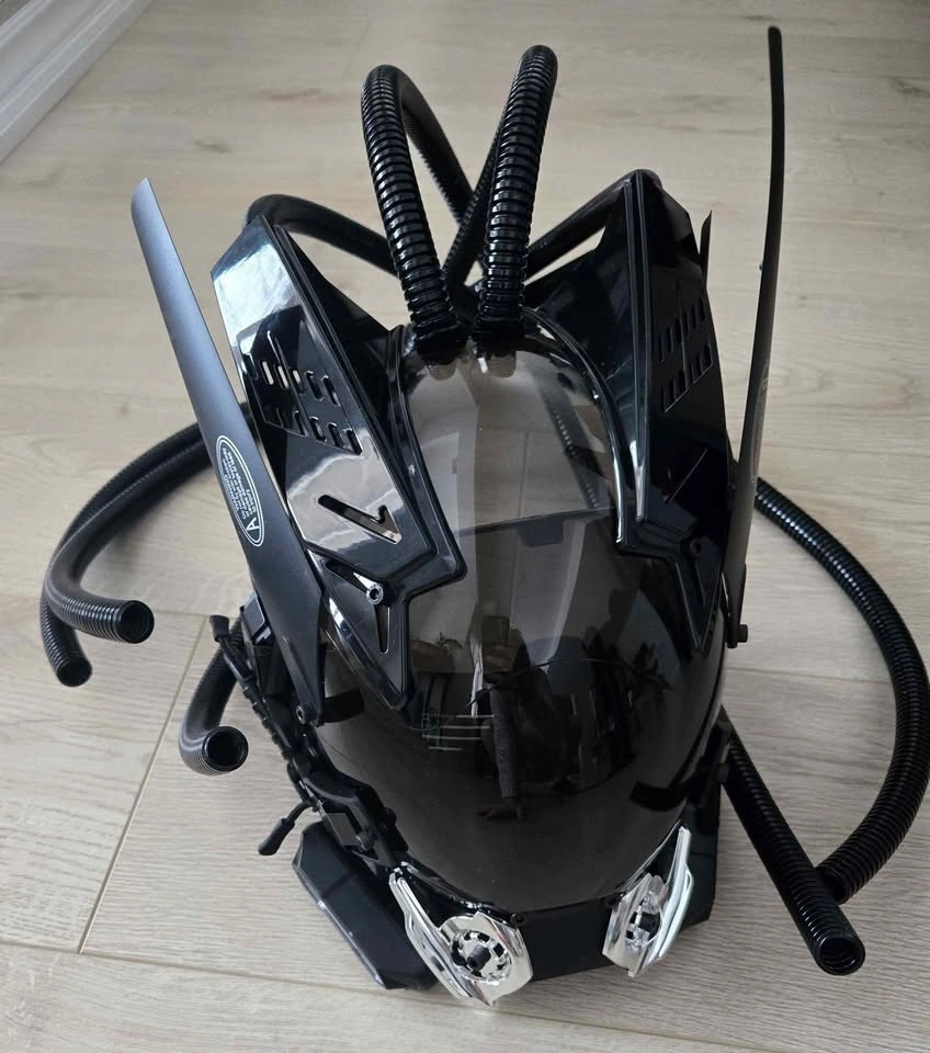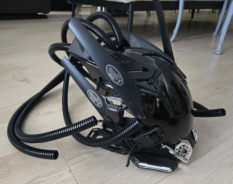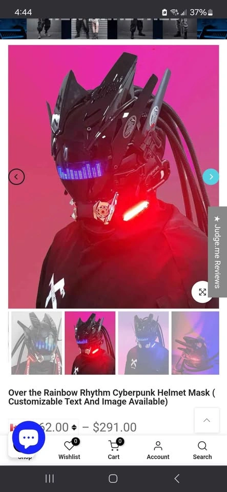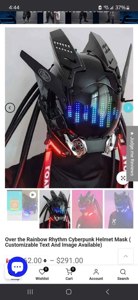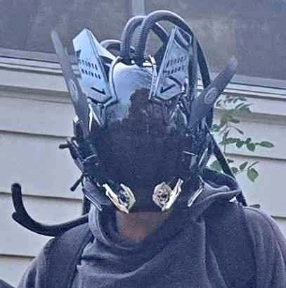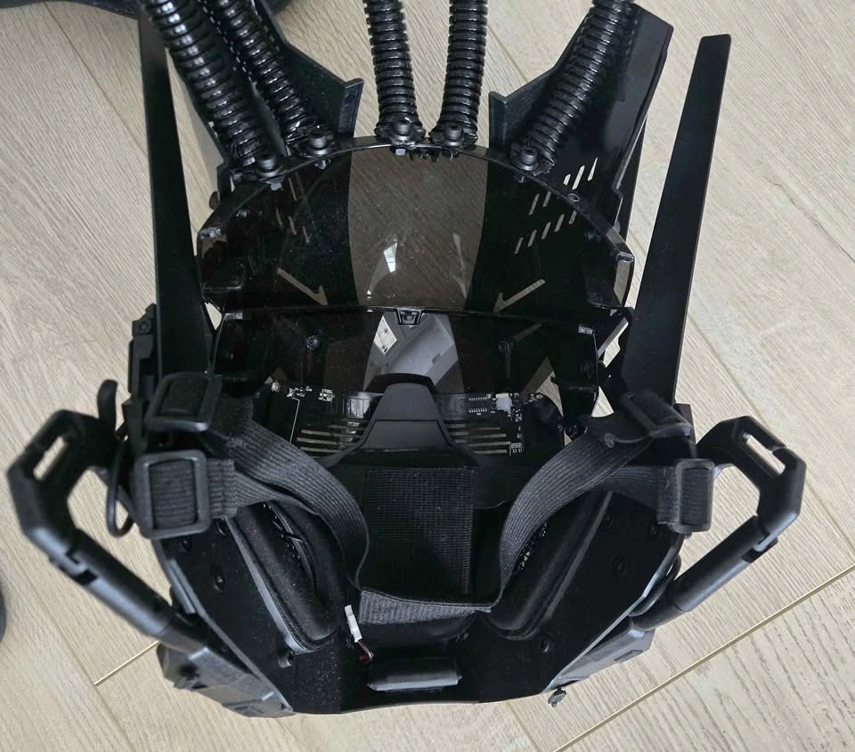 Over the Rainbow Rhythm Cyberpunk Helmet Mask. Used only for 1 hr. Black dreadlocks. One size. Premium material: PC Circumference: 55-65 cm. Text & image editable in App. There are 1 LED lights on the left and right side of the mask. 5 modes: the LED lights have five modes, blue is always on, blue is flashing, red is always on, red is flashing, red and blue are flashing alternately. USB cable included, which can charge the LED light. The elastic band of the mask is adjustable. Balaclava included. Although the mirror is black it will not affect your vision, even with glasses.