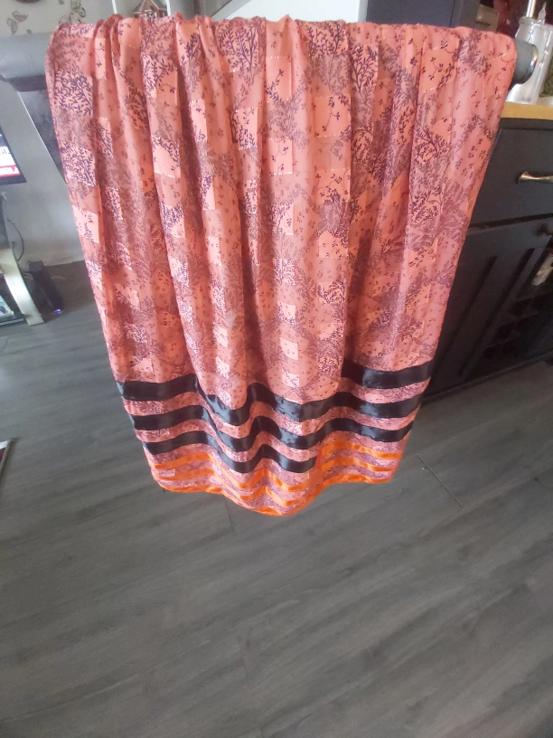 Lightweight peach coloured scarf. Features a pleated design and black and orange accents. Suitable for spring or summer.