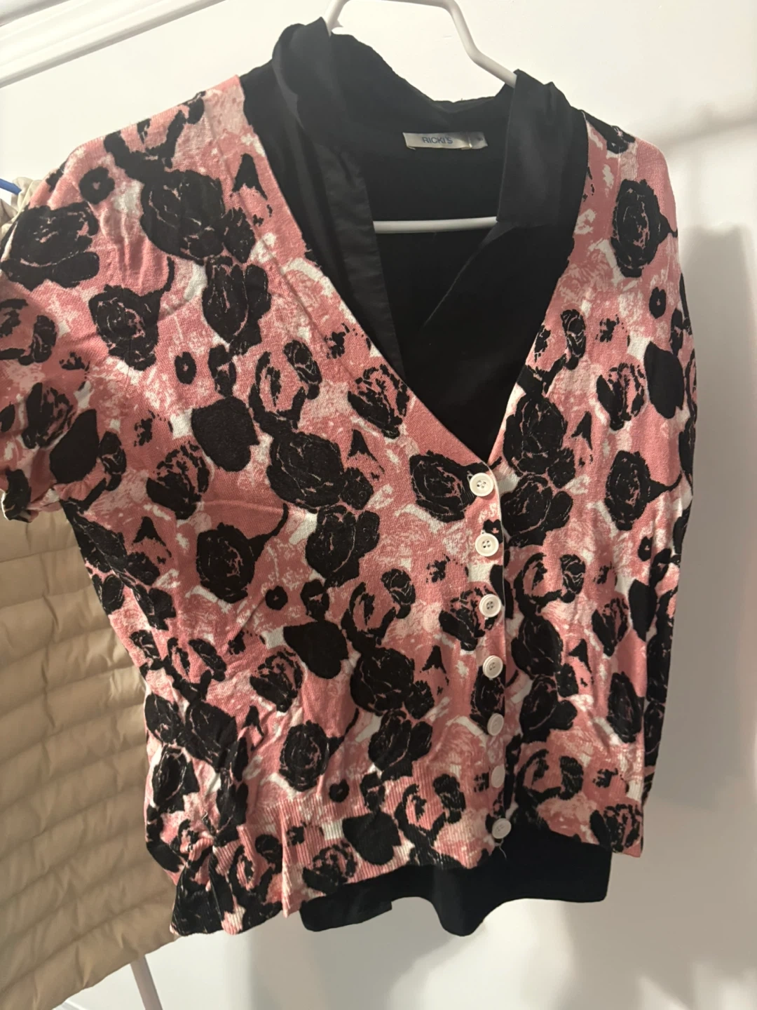 Here's a cute Ricki's cardigan with a floral print! It's pink with black flowers and has white buttons. Perfect for layering!
