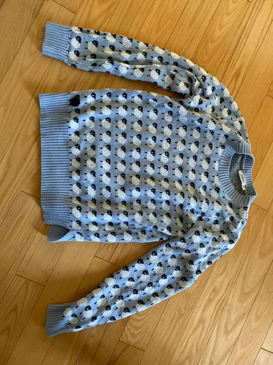 XS wool sweater from Ricki’s in a light blue colour with an adorable sheep design! On the front and back, one black sheep hides among the white. It's in great condition and ready to keep you warm and stylish ☺️