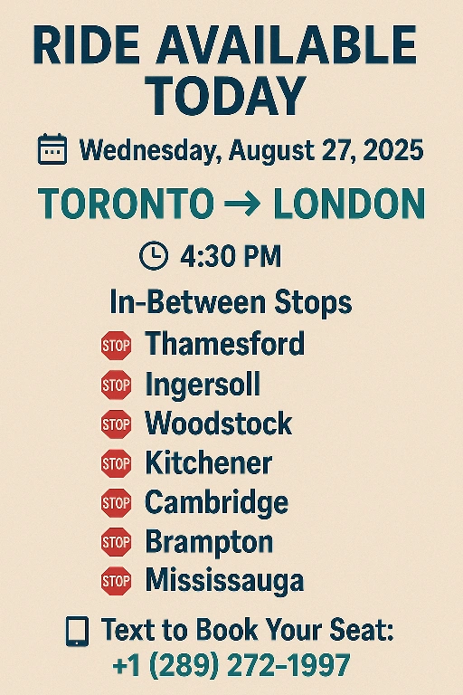 Ride available from Toronto to London on Wednesday, August 27, 2025 at 4:30 PM. In-between stops include Thamesford, Ingersoll, Woodstock, Kitchener, Cambridge, Brampton, and Mississauga. Text +1 (289) 272-1997 to book your seat