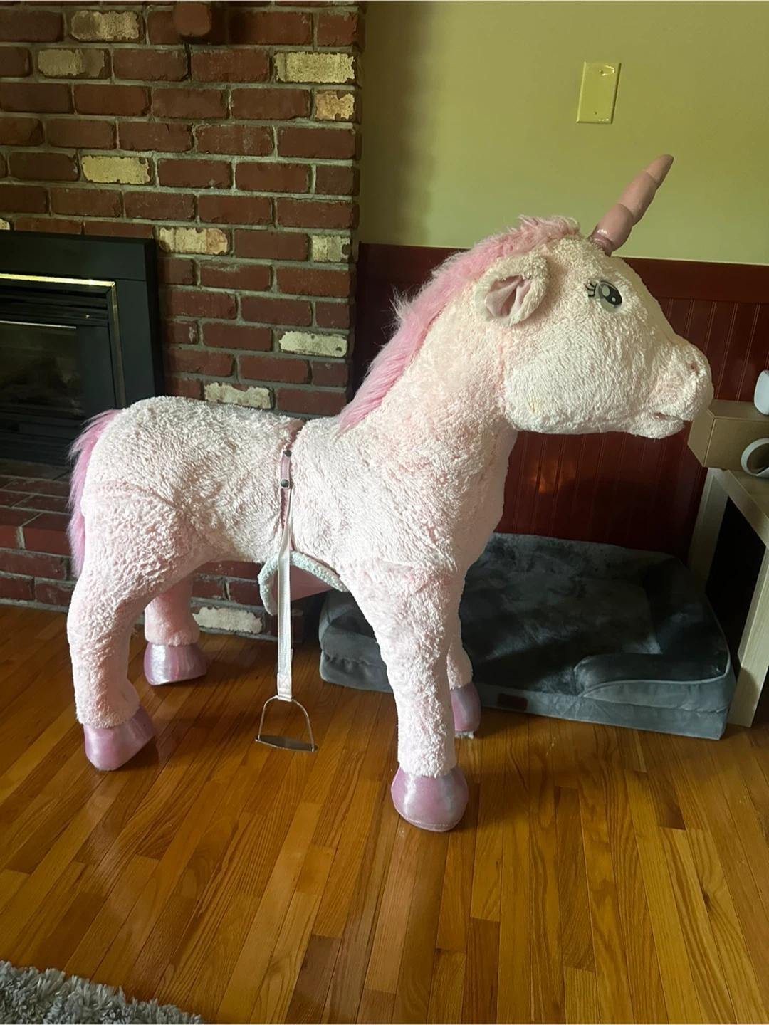 Selling a cute, ride-on plush unicorn toy! It's in great shape and ready for a new home. Perfect for kids who love unicorns and imaginative play. Does use batteries to make sounds but my daughter preferred playing on it without so have not used that feature in a couple years. Would be such a great present for a little one who loves using their imagination.