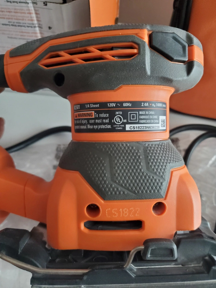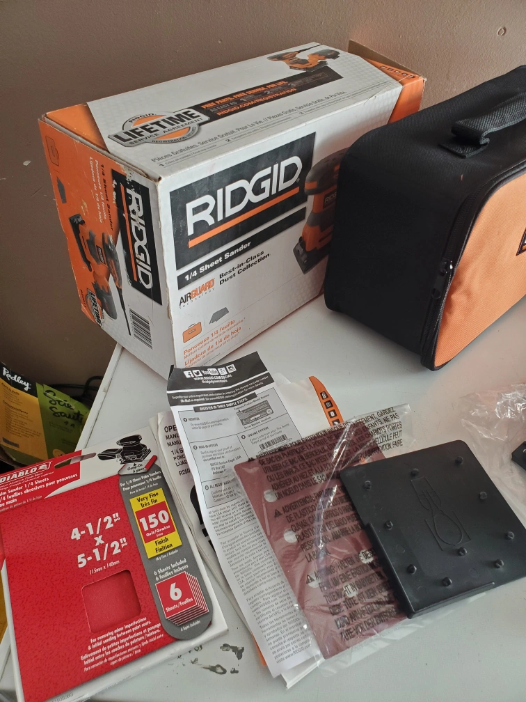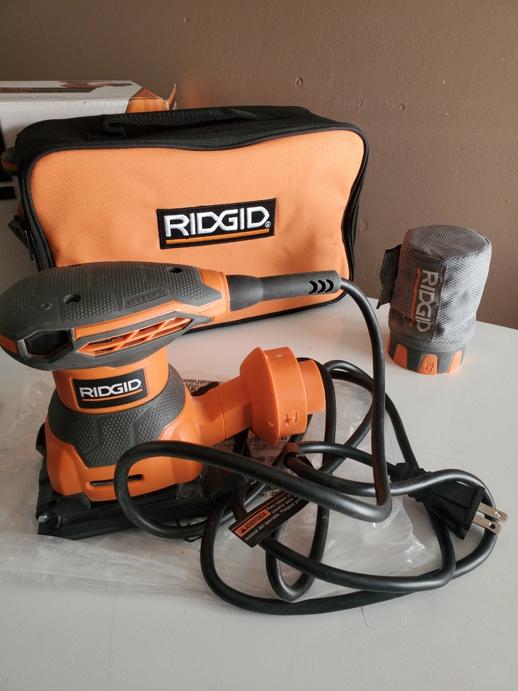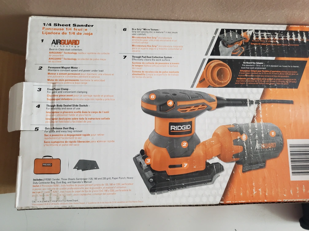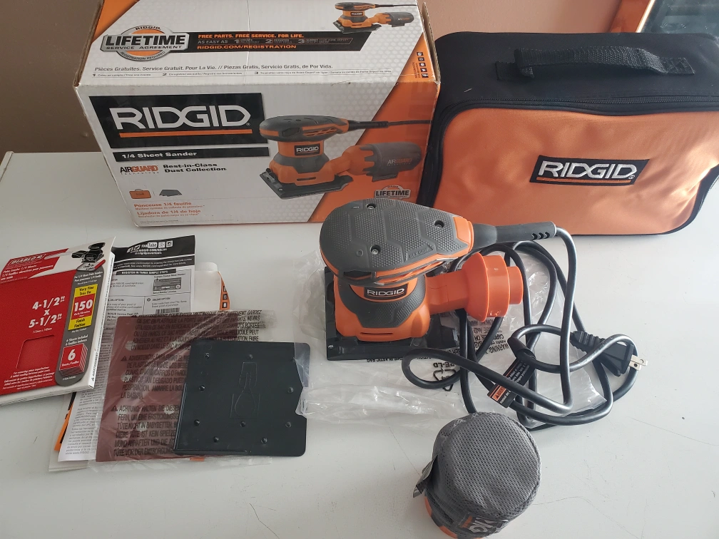 The Ridgid 1/4 Sheet Sander features through body sealed slide switch for reliability and ease of use, an onboard vacuum adaptor that fits standard vacuum hoses, oversized quick release tabs for securing standard paper, and a Permanent Magnet Motor that maintains constant speed and power during loaded conditions. An active through pad dust collection also provides for a cleaner work environment. Onboard vacuum adaptor fits standard vacuum hoses Oversized quick release tabs for securing standard paper Permanent Magnet Motor maintains constant speed and power during loaded conditions Active through pad dust collection for a cleaner work environment Includes three sheets of paper (120, 180, 220 grit), paper punch, dust bag and heavy duty contractor bag Input: 2.4 amps; No Load Speed: 14,000 OPM; Orbit Diameter: 1/16-Inch; Tool Weight: 3.1 lbs extra pads included delivery available