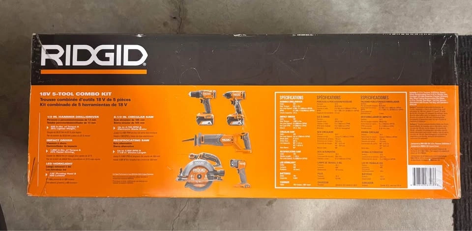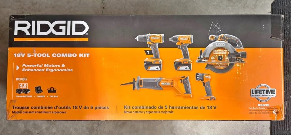 RIDGID 18V 5-Tool Kit with two 4.0 Ah Batteries with a Charger. Great starter kit. Model # R9635. This is brand new still in an unopened box. Pick up in SW Airdrie.