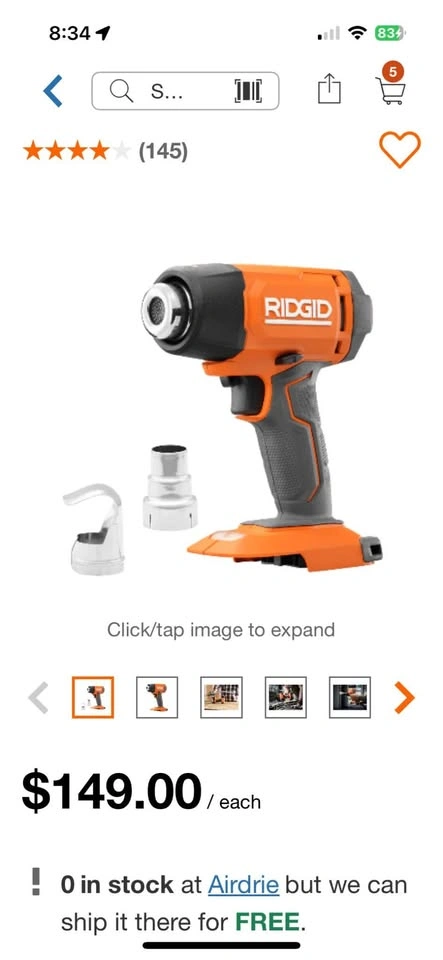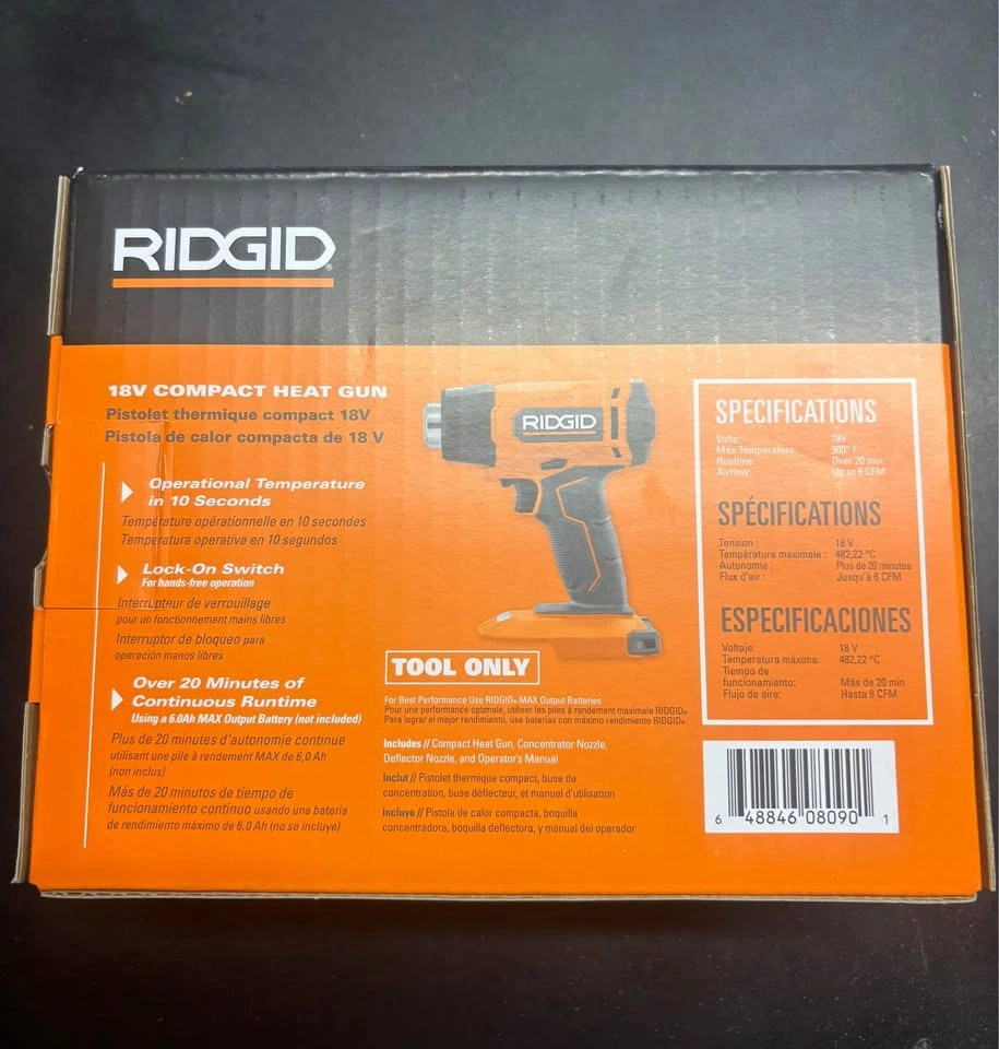 RIDGID 18V Cordless Compact Heat Gun Model # R860435B no battery included. This is brand new still in the unopened box. Pick up in SW Airdrie.