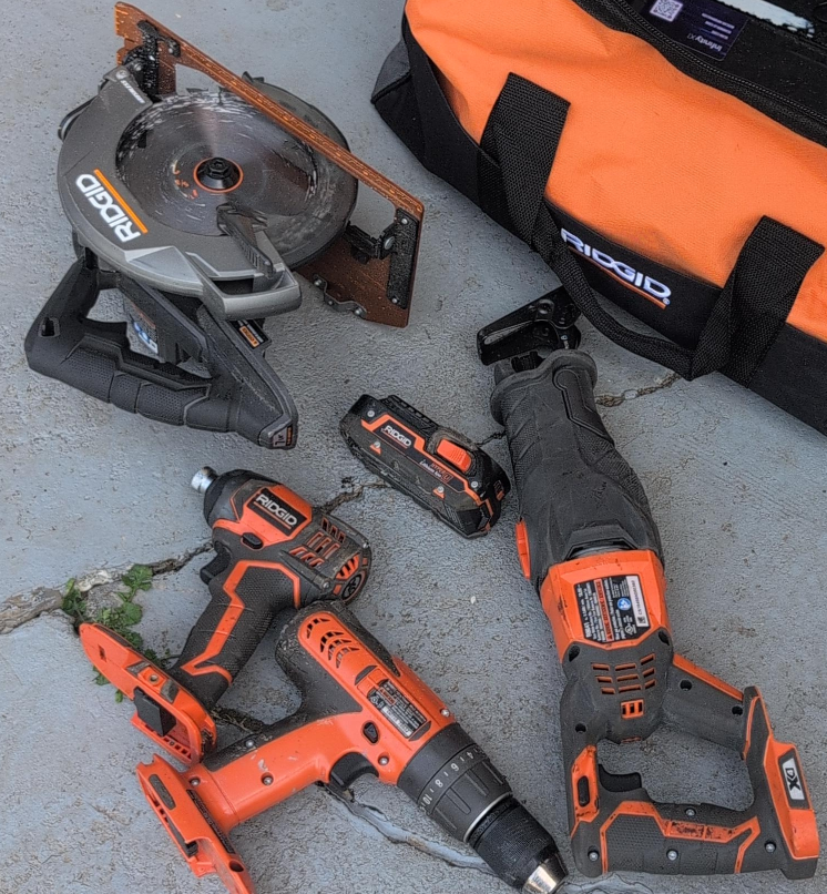 Selling a set of Ridgid power tools! Includes a circular saw, reciprocating saw, impact driver, and drill. All in used condition, but still have lots of life left in them. Comes with a Ridgid tool bag and battery