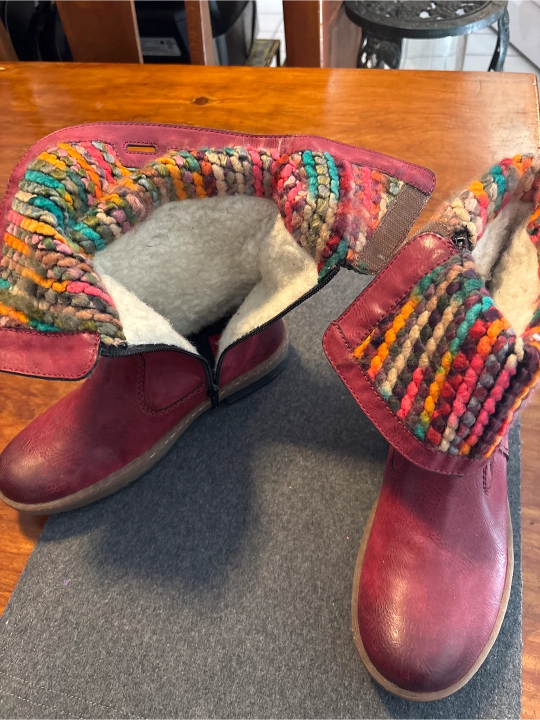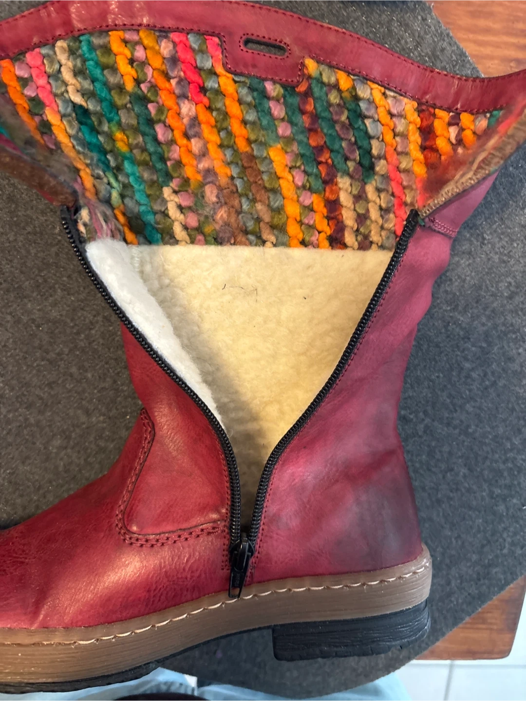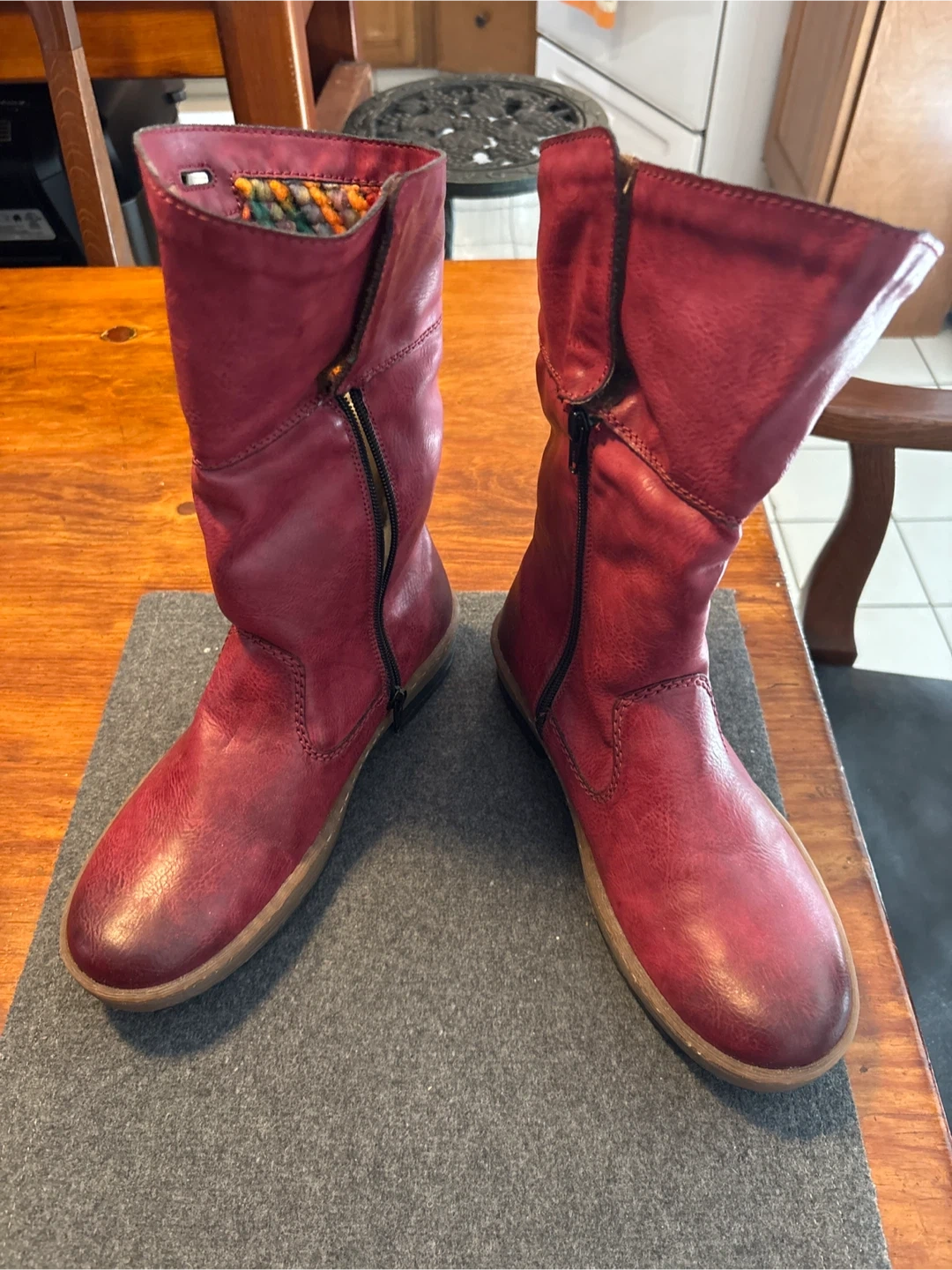 Rieker red LEATHER boots! They are a size 39, which is about a size 8. The inside has a cozy lining and a colourful knit detail around the top. Brand new. Never worn.