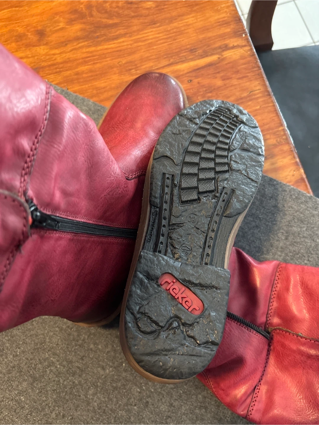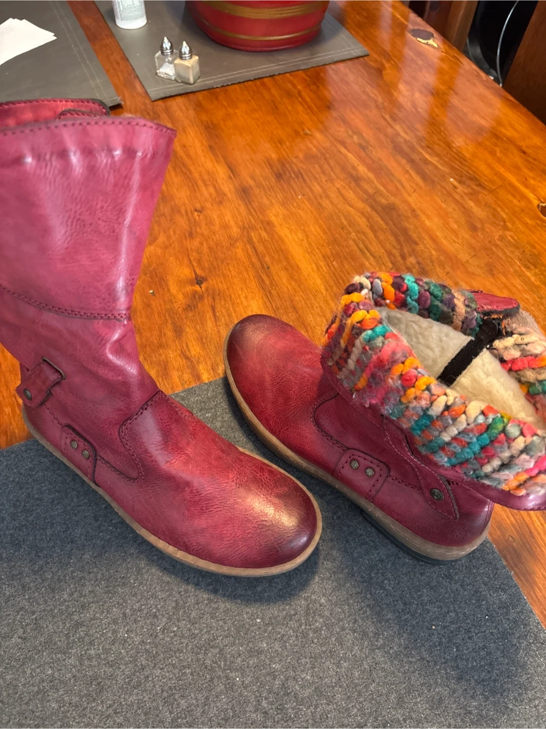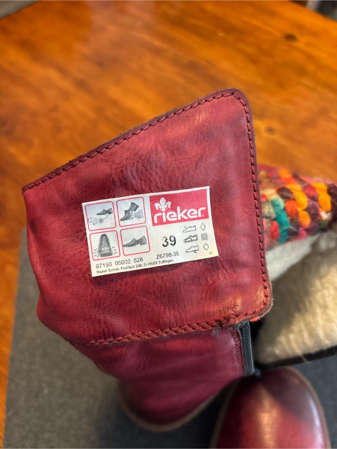 Rieker red LEATHER boots! They are a size 39, which is about a size 8. The inside has a cozy lining and a colourful knit detail around the top. Brand new. Never worn.