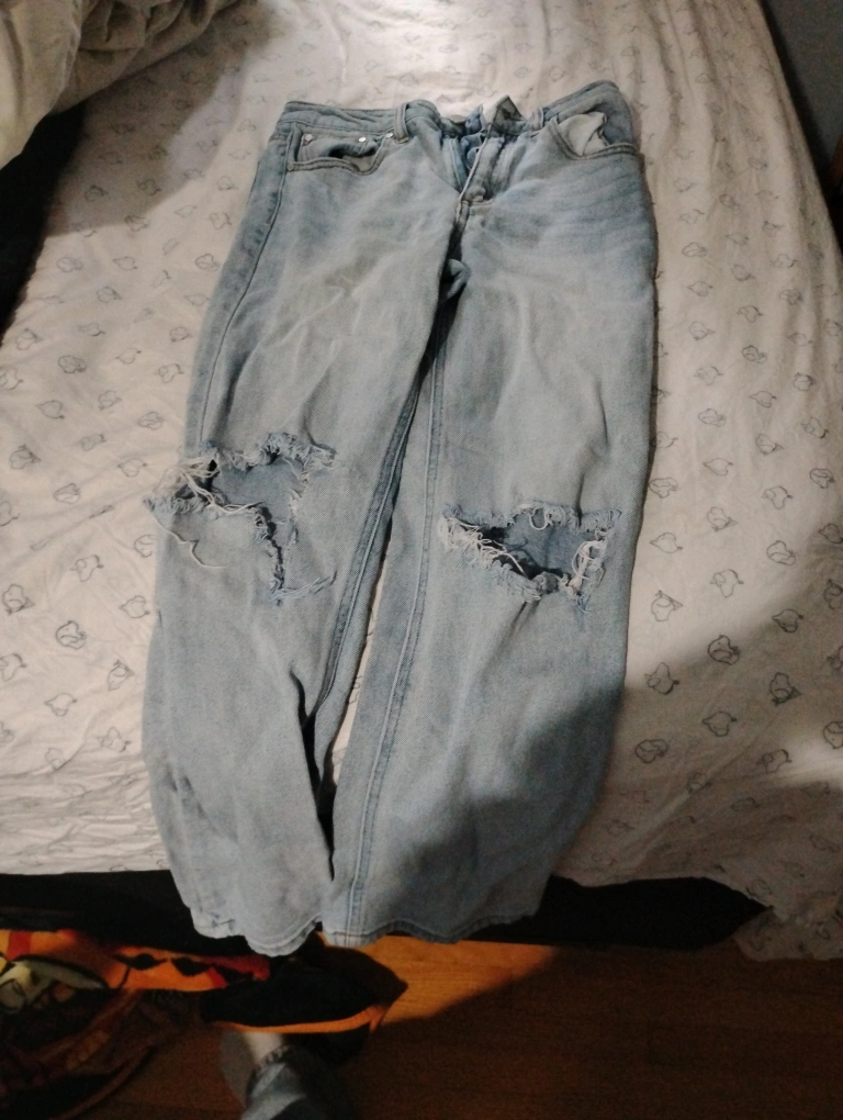 Selling a pair of light wash jeans with a ripped design. They're in good condition and ready for a new home! Perfect for a casual, edgy look