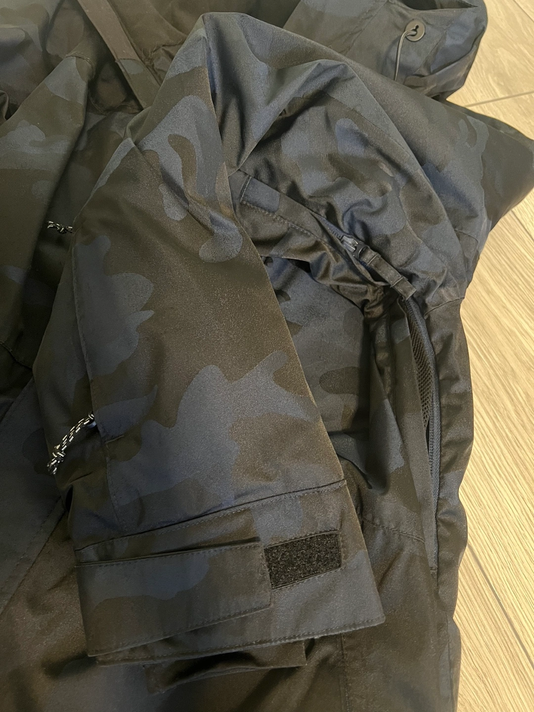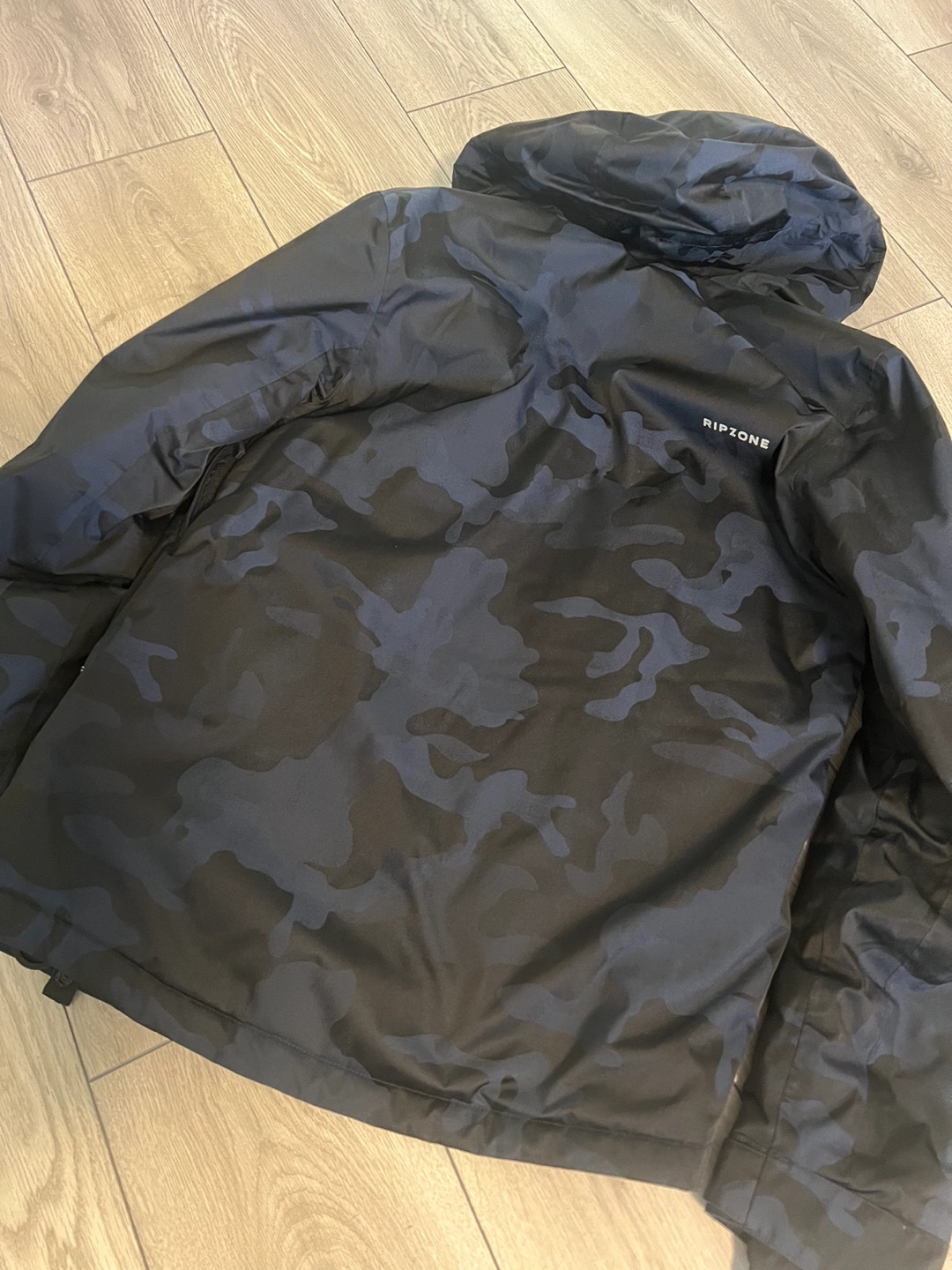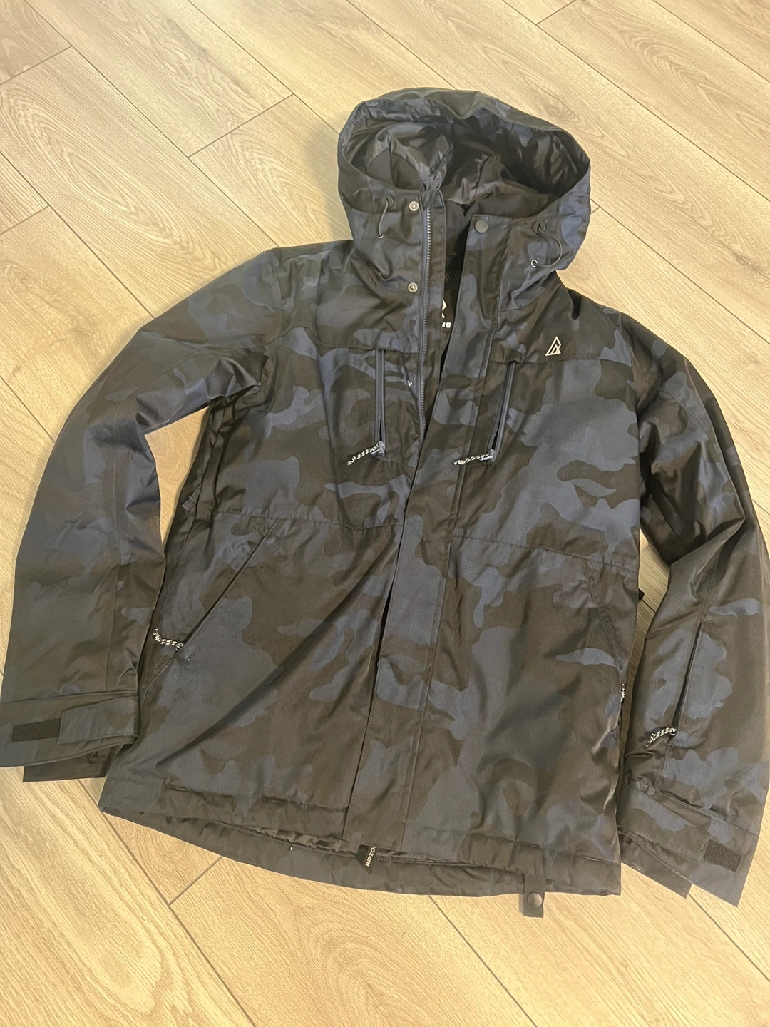 -Black camo ski jacket with a hood -Features include inner pocket, cuffs, and zippered pockets -Size S