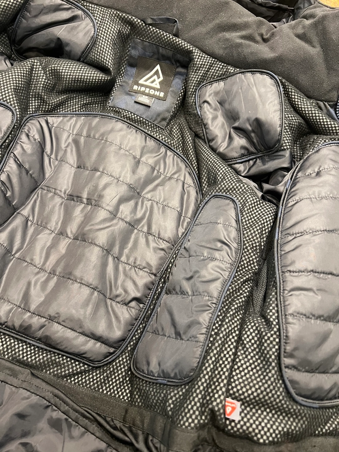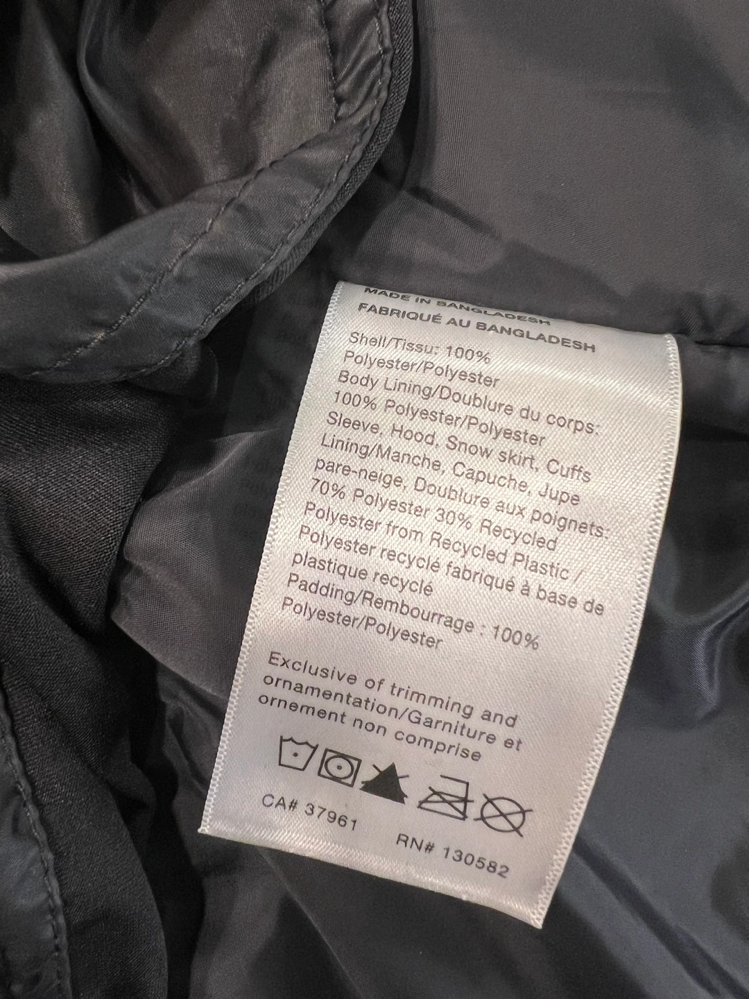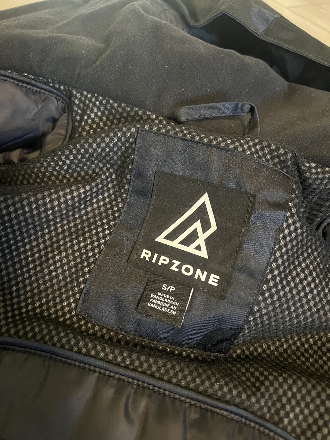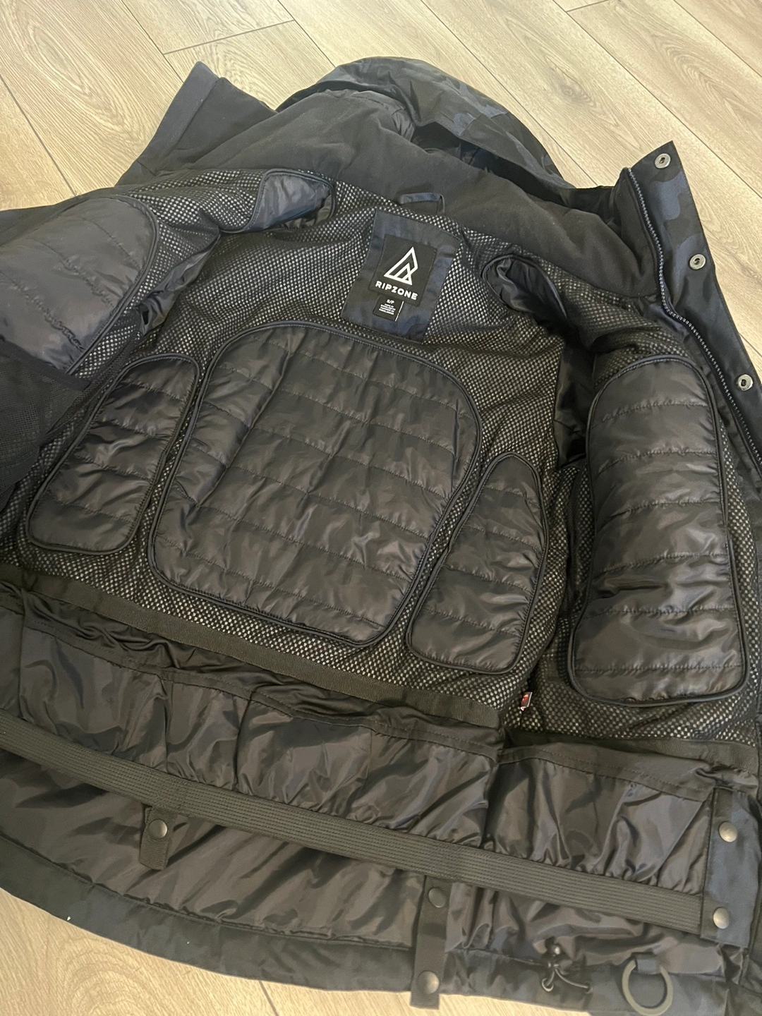 -Black camo ski jacket with a hood -Features include inner pocket, cuffs, and zippered pockets -Size S