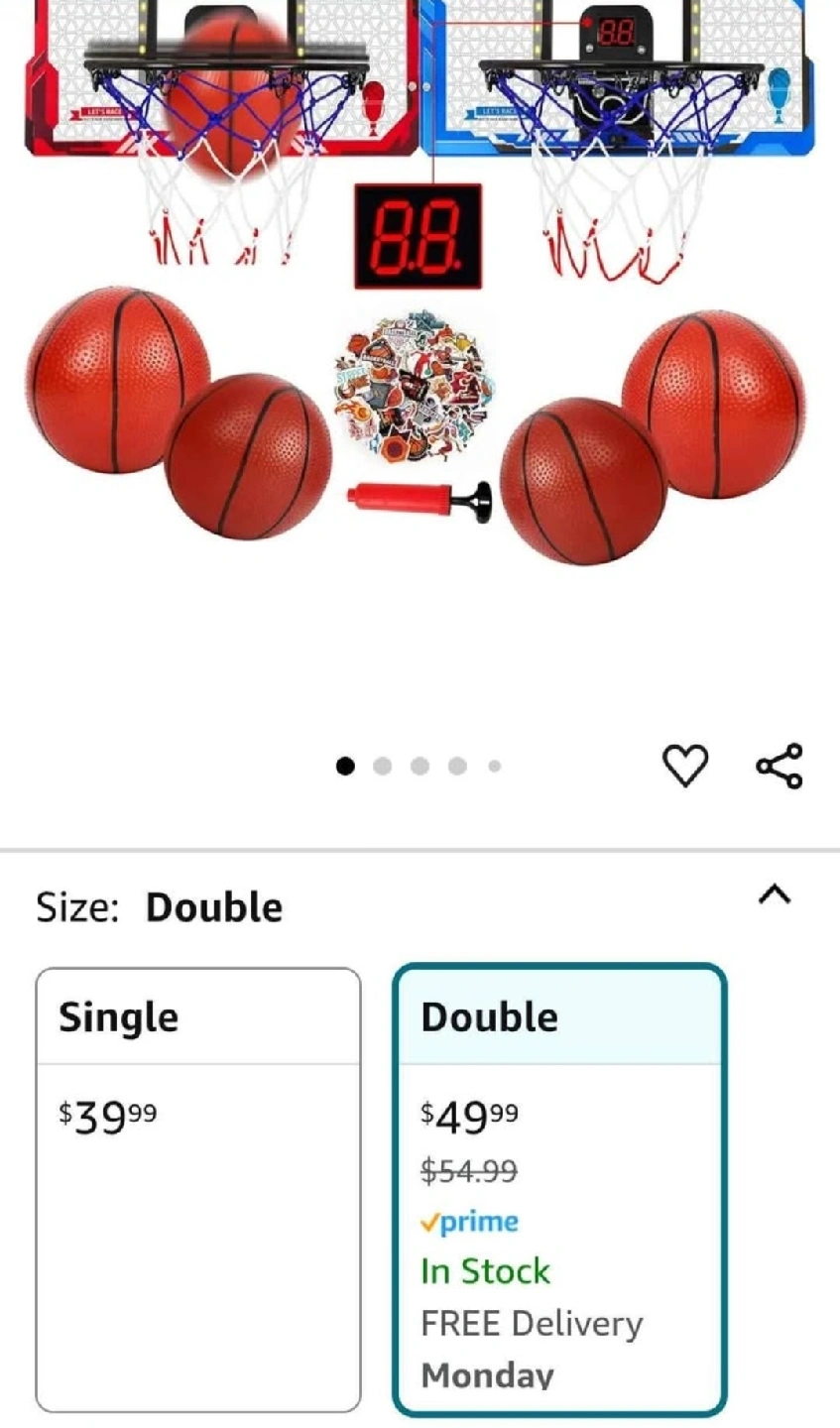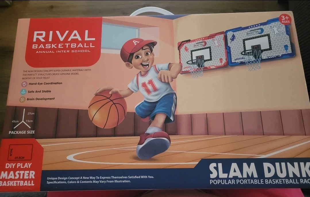 Get ready for some indoor fun with this Rival Basketball Slam Dunk set! It's a double hoop setup, perfect for some friendly competition. The set includes an electronic scoreboard, basketballs, and a pump. It's designed for ages 3+ and is a great way to encourage hand-eye coordination and brain development. Originally bought for $49.99!