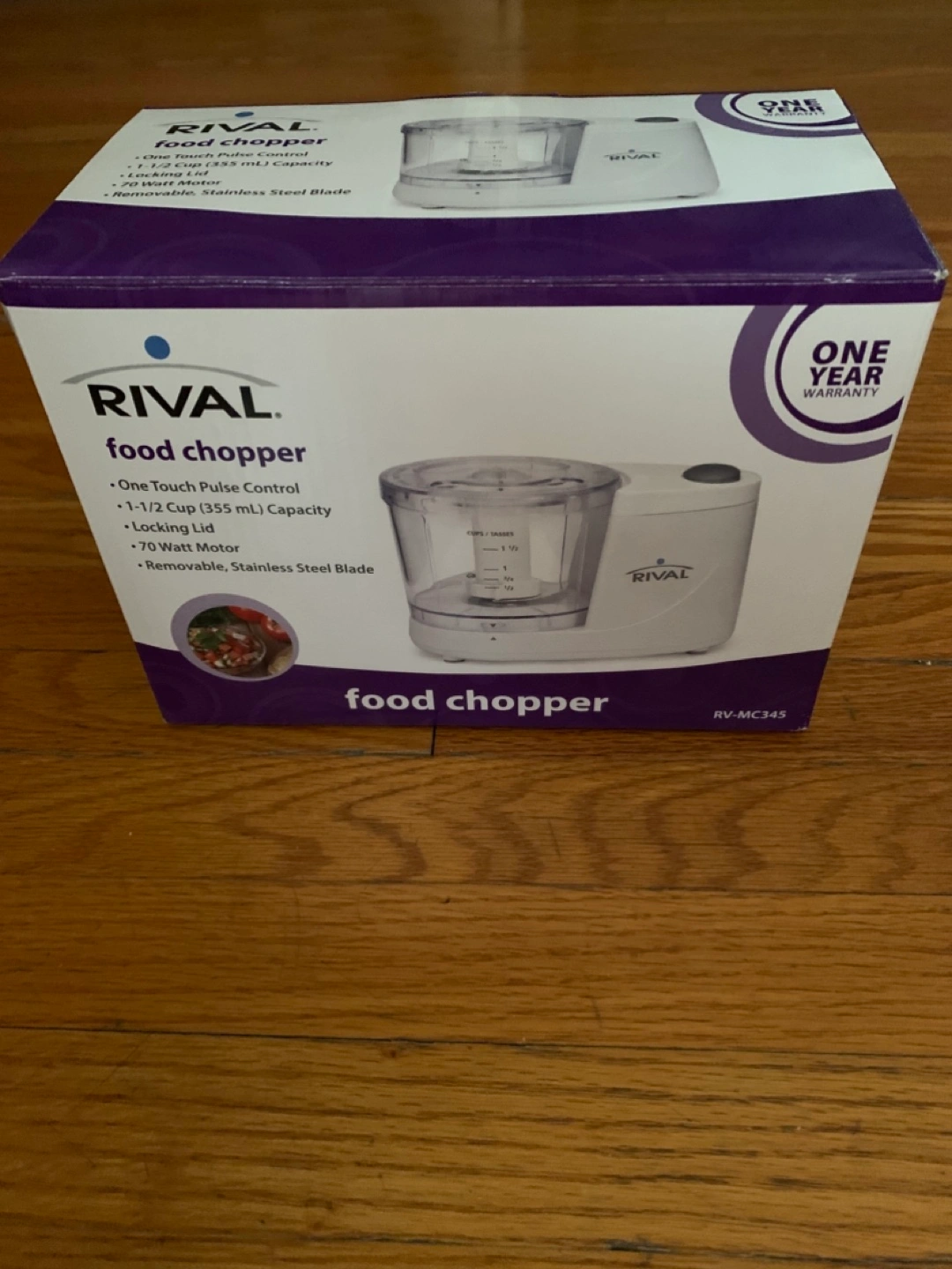 Like New Rival food chopper. One touch pulse control, 1 1/2 cup capacity, locking lid, 70-watt motor, removable stainless steel blade. One-year warranty.