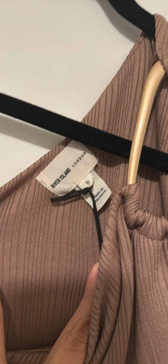 Selling a River Island London dress in a lovely neutral tone! It's a size 10 and features a unique one-shoulder design with a gold ring detail. The material has a ribbed texture, adding a touch of elegance to the dress