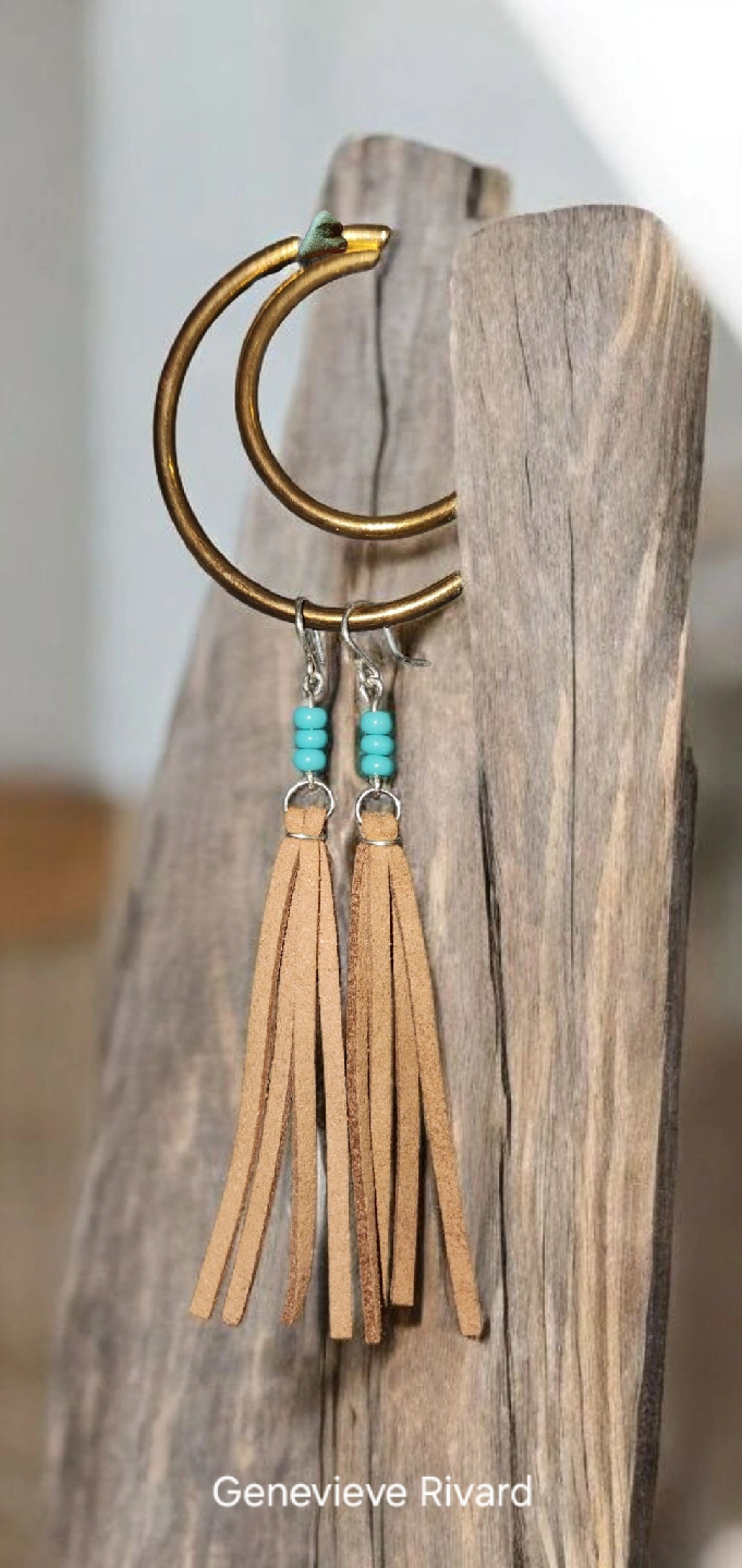 These tassel drop earrings are a beautiful blend of rustic and bohemian styles, making them a versatile accessory. Materials: sterling silver wire, leather cord, plastic beads Colours: silver, tan, light blue Length: approx 3 inches Shipping with tracking available