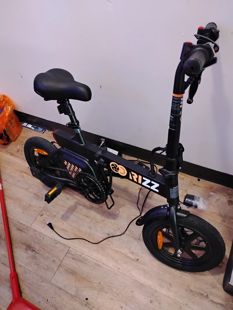 Selling a Rizz Gyrocycle folding e-bike in black! Perfect for getting around town or commuting. It comes with a charger so you can keep it powered up and ready to go