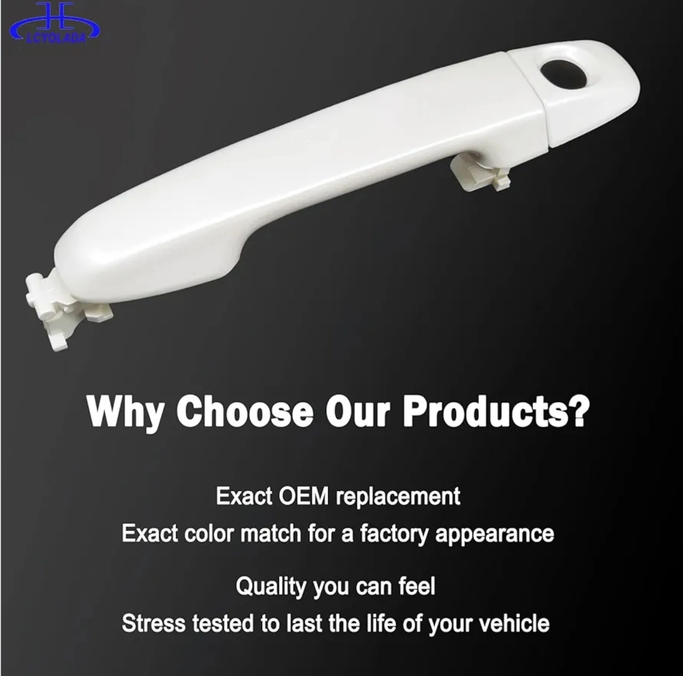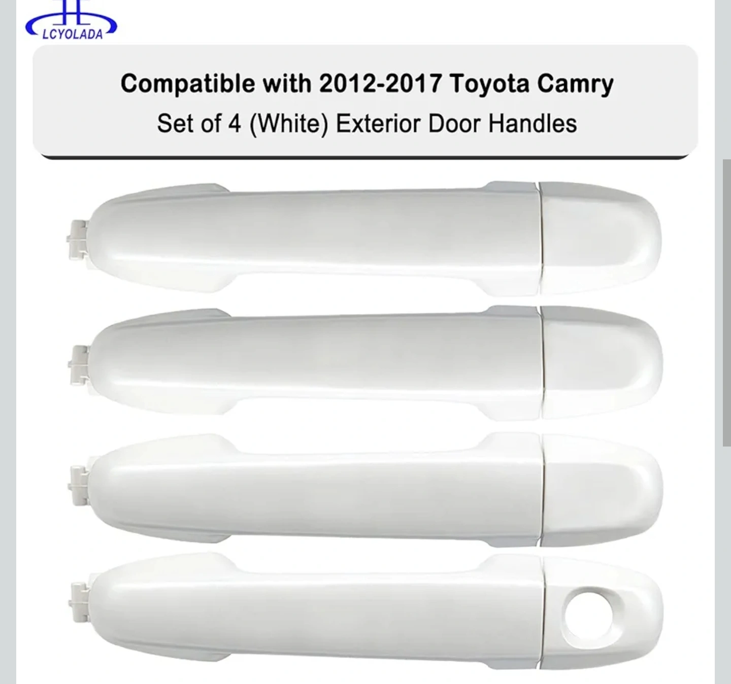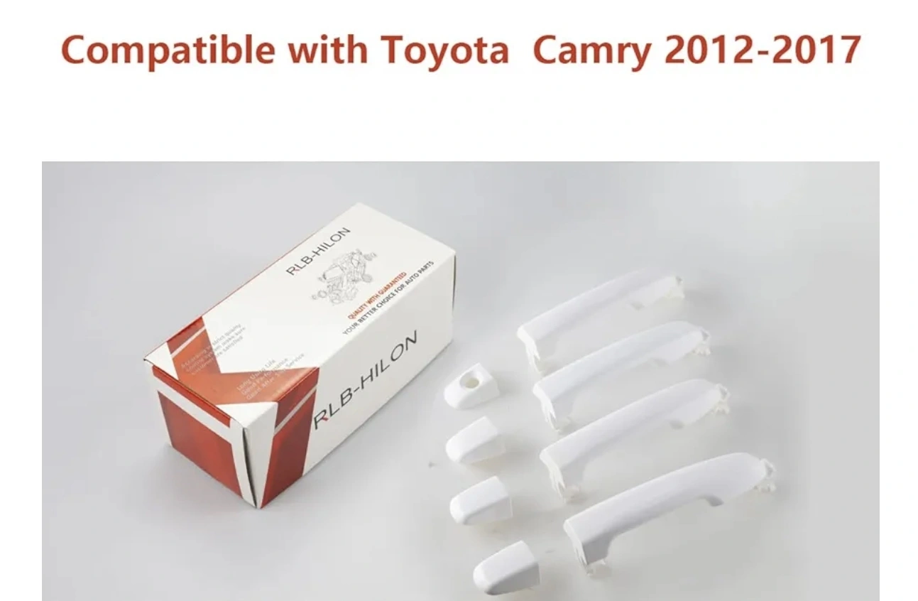 Selling a set of RLB-HILON exterior door handles compatible with Toyota Camry models from 2012-2017. The package includes one front left drive side exterior door handle, one front right passenger side exterior door handle, one rear left drive side exterior door handle, and one rear right passenger side exterior door handle. These are exact OEM replacements and provide an exact color match for a factory appearance. They are stress-tested to last the life of your vehicle. The handle size is approximately 3.54 inches in length and 1.85 inches in width