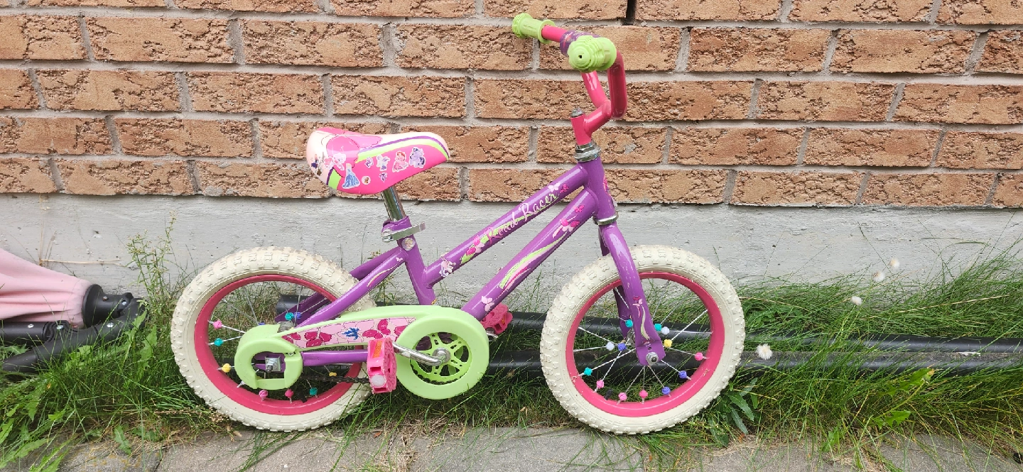 A cute purple 'Road Racer' bike. It has a pink seat with princess designs and green pedals. The tires are white with pink detailing. Perfect for a young child learning to ride!