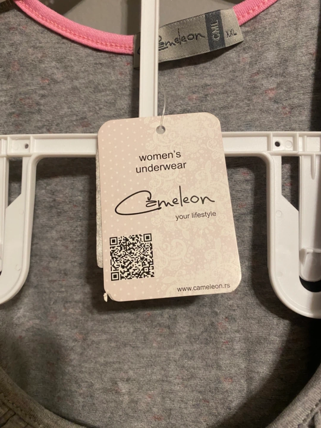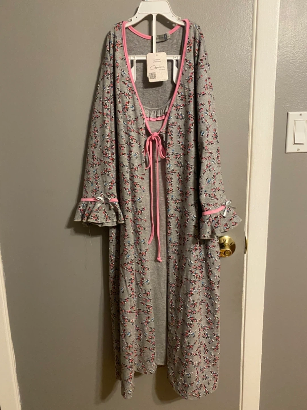 Selling a Cameleon women's robe and nightgown set in size XXL. The material is 95% cotton and 5% elastane. It features a grey colour with a pink trim. It's brand new with tags. Although it says XXL it fits more like a small/medium.