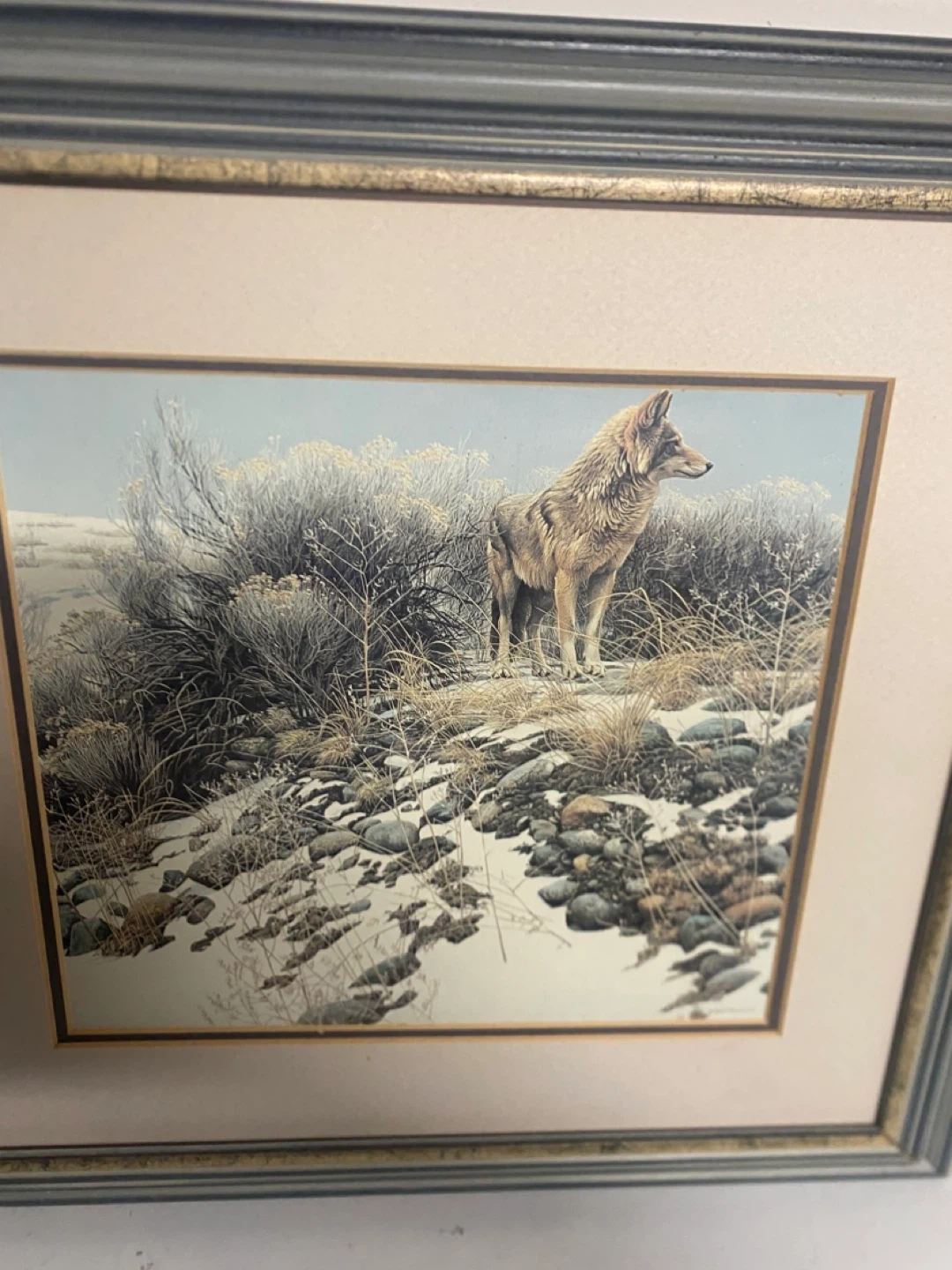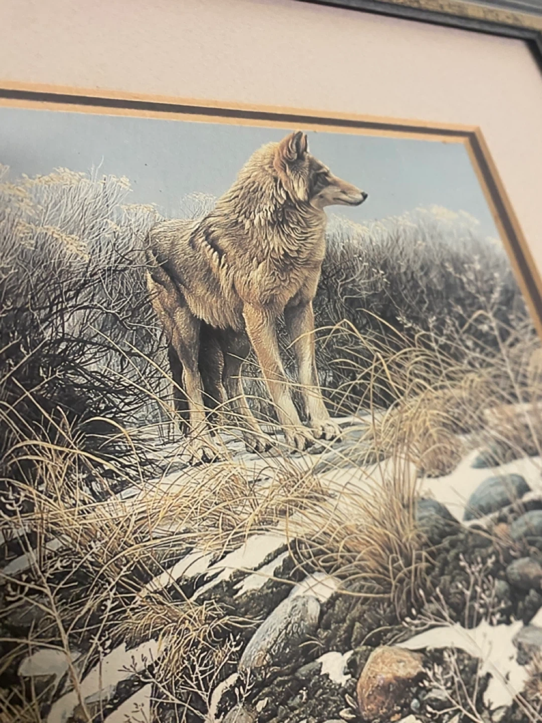 Selling a Robert Bateman print from 1987. It features a beautiful winter scene with a coyote. Perfect for any art lover! No glass. Has a very slight dent that’s barely noticeable