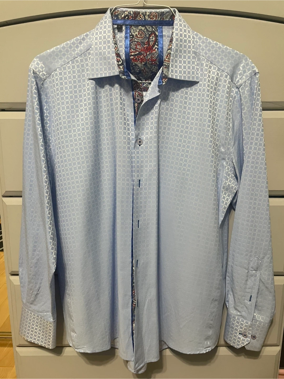 Here's a Robert Graham dress shirt in a light blue patterned design! It features a unique paisley pattern on the inside of the collar and cuffs, adding a touch of flair. Perfect for dressing up or down, this shirt is sure to make a statement
