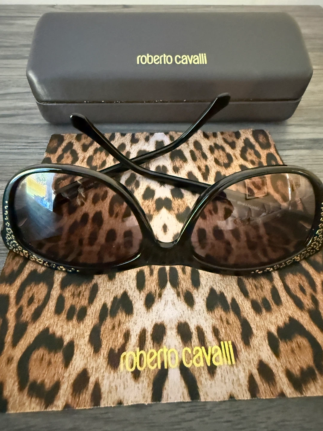 Selling a pair of Roberto Cavalli sunglasses, model Tsize 991S. They come with a case and a leopard print cloth. The size is 55[]17 140 +2.