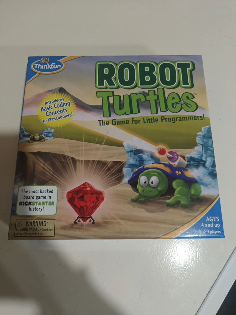Educational board game for preschoolers. Introduces basic coding concepts. Fun for 2-5 players, ages 4+. Includes game board, robot turtles, tiles, and code cards. The most backed Kickstarter board game in history.