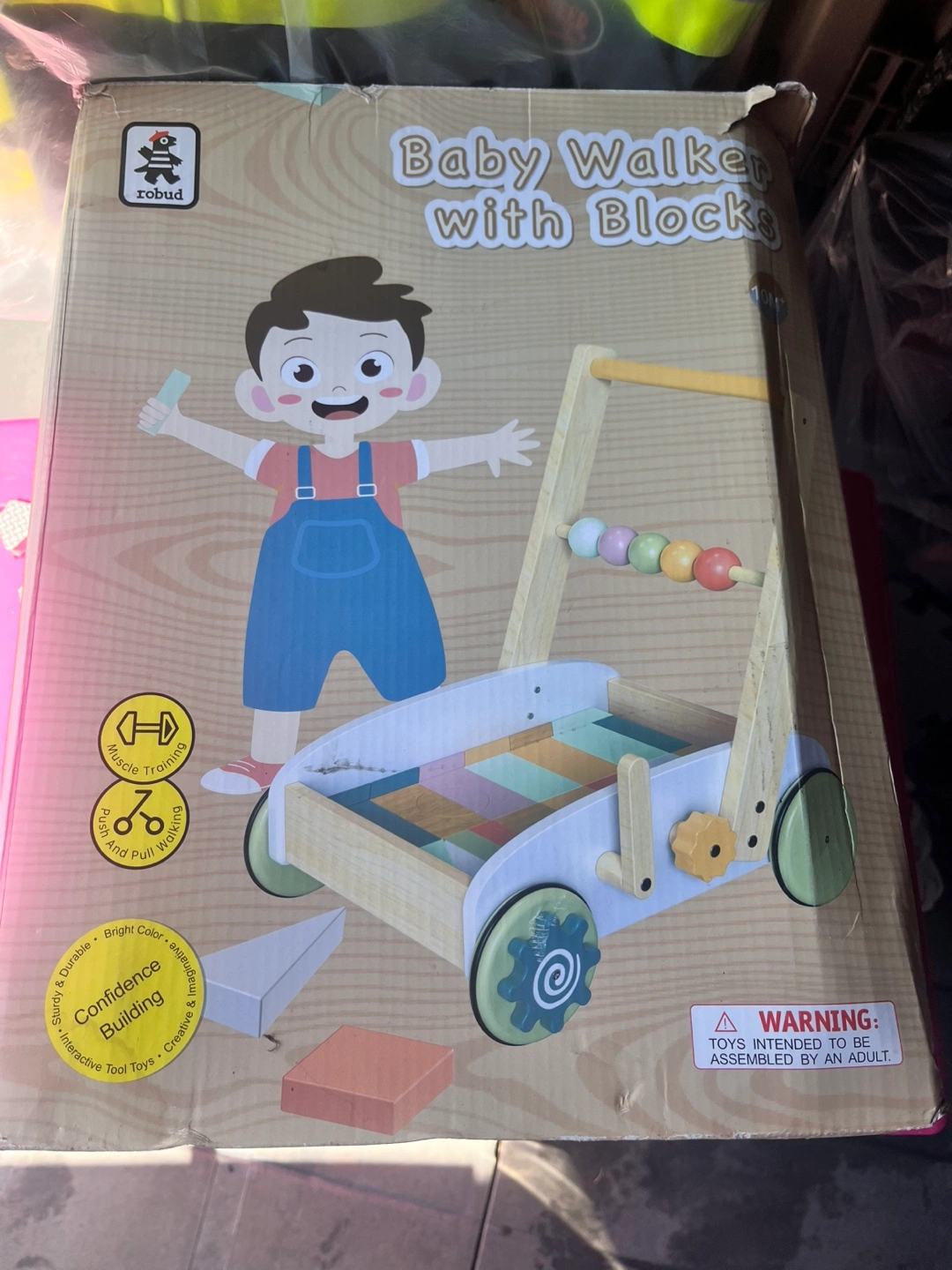 New in box. Wooden baby walker. Includes colourful blocks and abacus. Great for early childhood development. Suitable for toddlers. *PICKUP NEAR JANE AND EGLINTON *