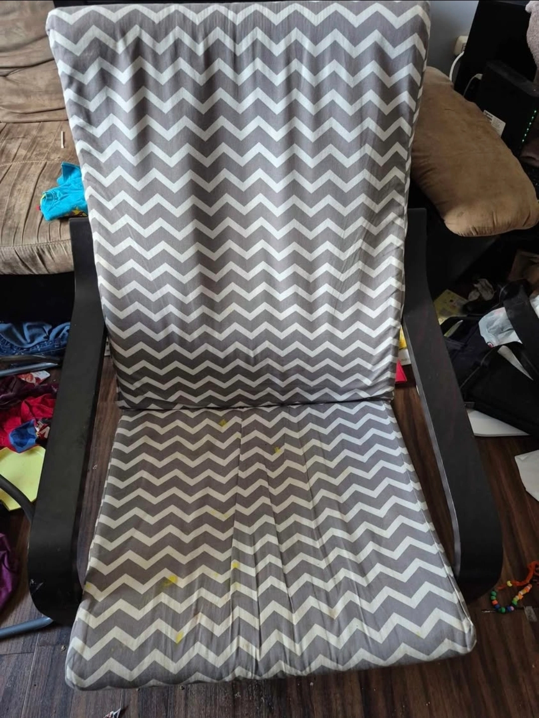 Selling a rocker chair with a grey and white chevron patterned cushion. The chair has a dark wood frame. There are some stains on the seat cushion that will likely come out with a quick cleaning.