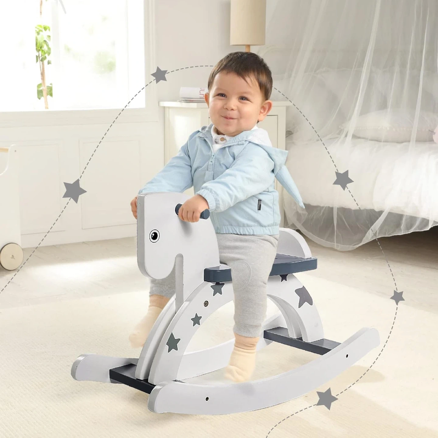 Here's a cute rocking horse, perfect for little ones! It's in great shape and ready for a new home. Approximate dimensions: - Height: 19 inches - Length: 26.8 inches - Seat Height: 12 inches It's a lovely grey and white colour that would fit in any nursery or playroom