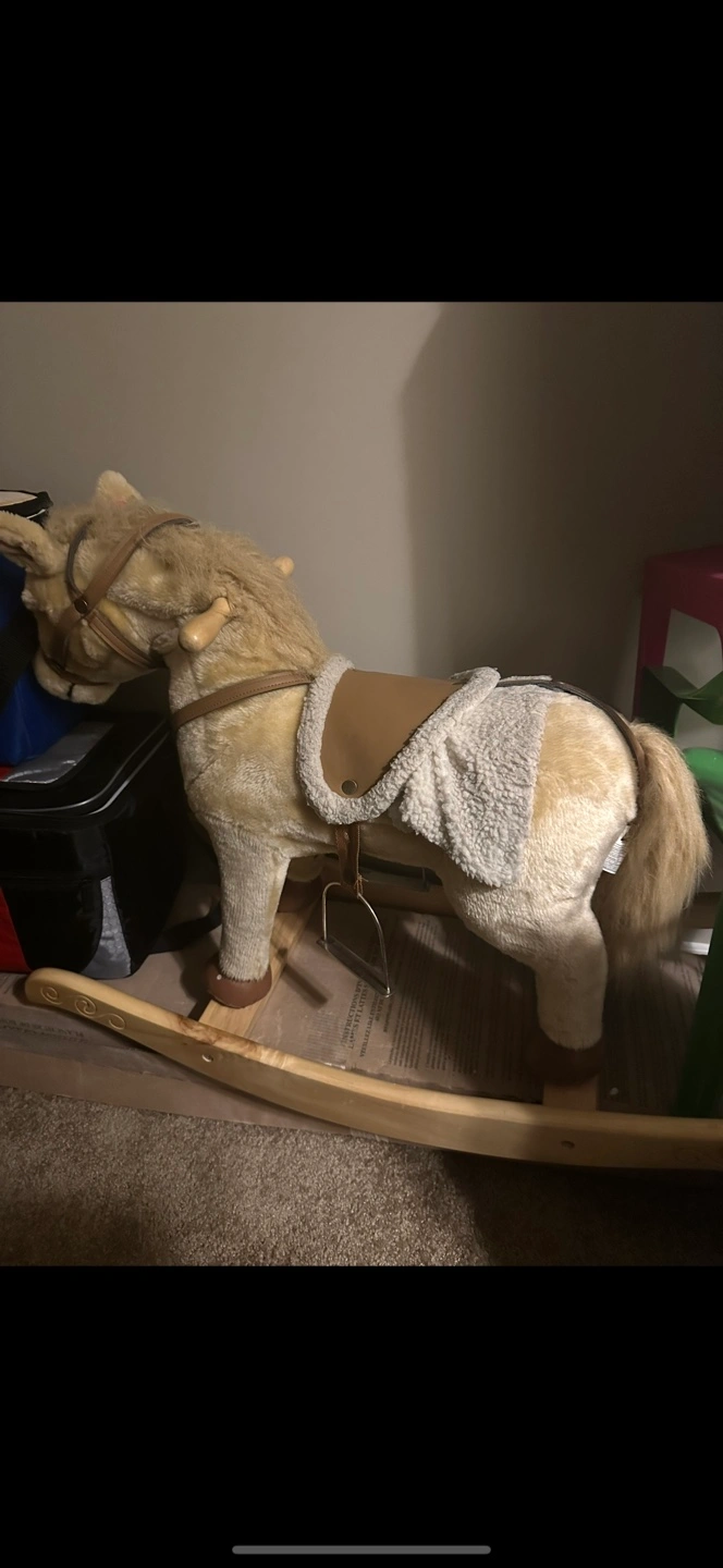 Selling a rocking horse in brand new condition . It has a saddle and stirrups. Perfect for a young child! Perfect for a gift Bought for a gift but end up in the storage