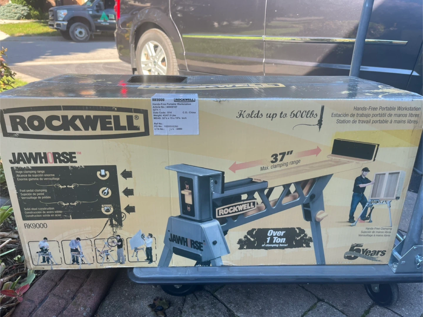Selling a Rockwell JawHorse Hands-Free Portable Workstation. It holds up to 600lbs and has a 37" max clamping range. It also features hands-free clamping and a foot pedal clamping mechanism. The weight is 43/47.5 lbs and the measurements are 32 7/8 x 15 x 15 3/8 inch